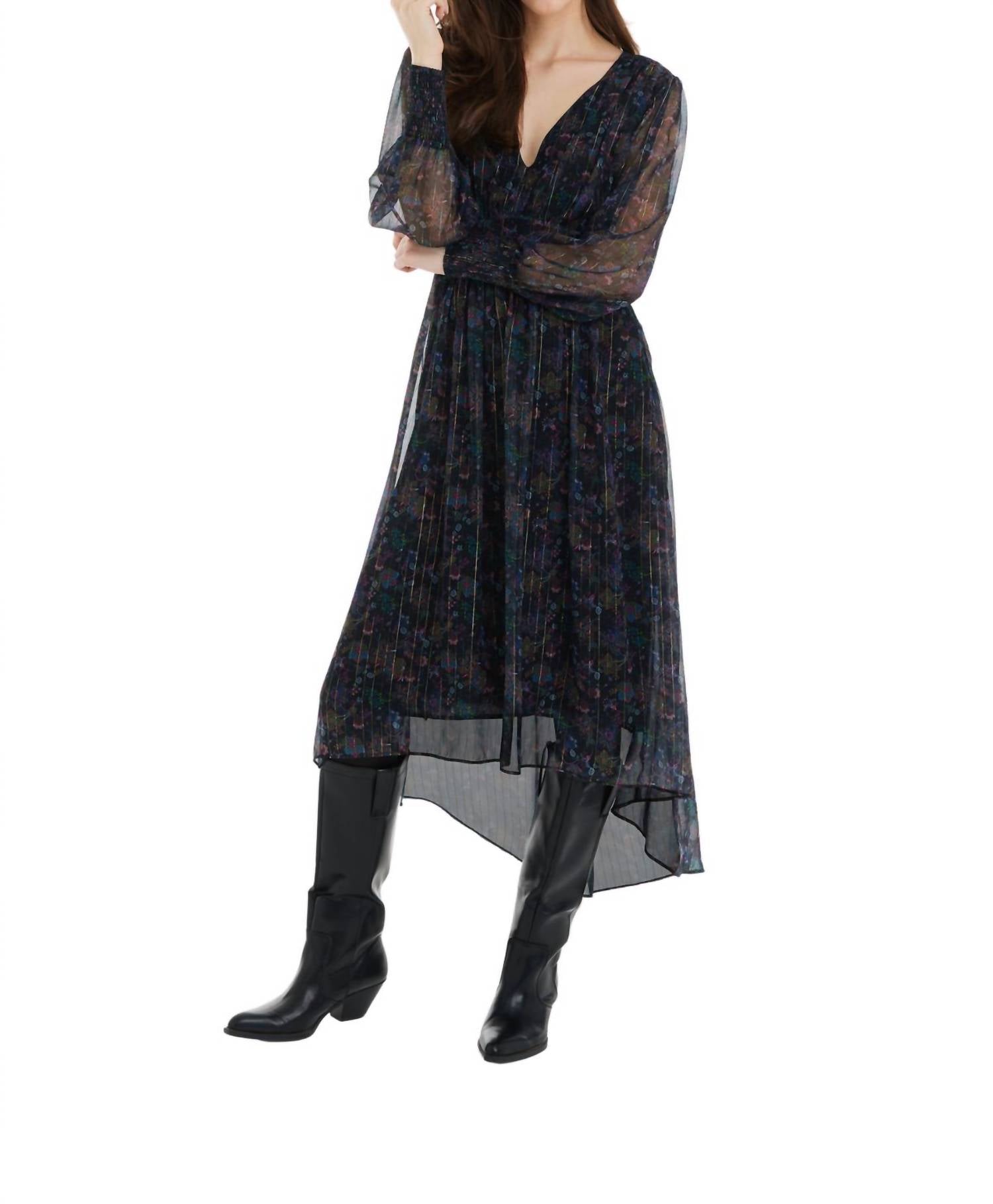 This Reeve Midi Dress is cut in a shimmering metallic chiffon fabrication. paisley print. V neckline and wide waistband with shirring. Fixed waist. Flowing skirt with a ruffle hem. Sheer long sleeves end in a smocked cuff. Fully lined with a side zipper closure. Fabrication: Body: 95% Polyester, 5% Lurex | Lining: 100% Rayon. Hand wash, lay flat to dry or dry clean. Model is 5'9" and wearing a size Small.