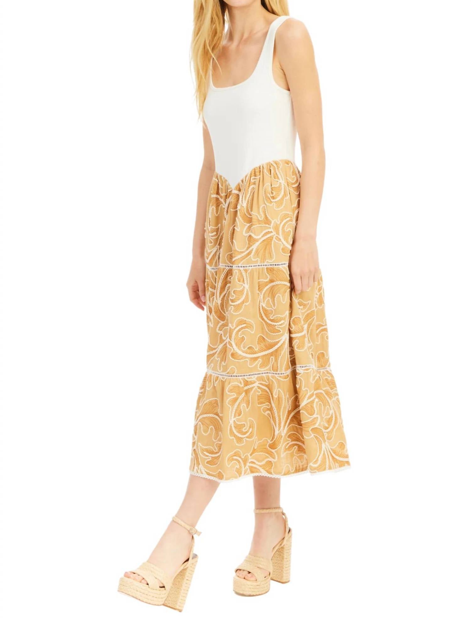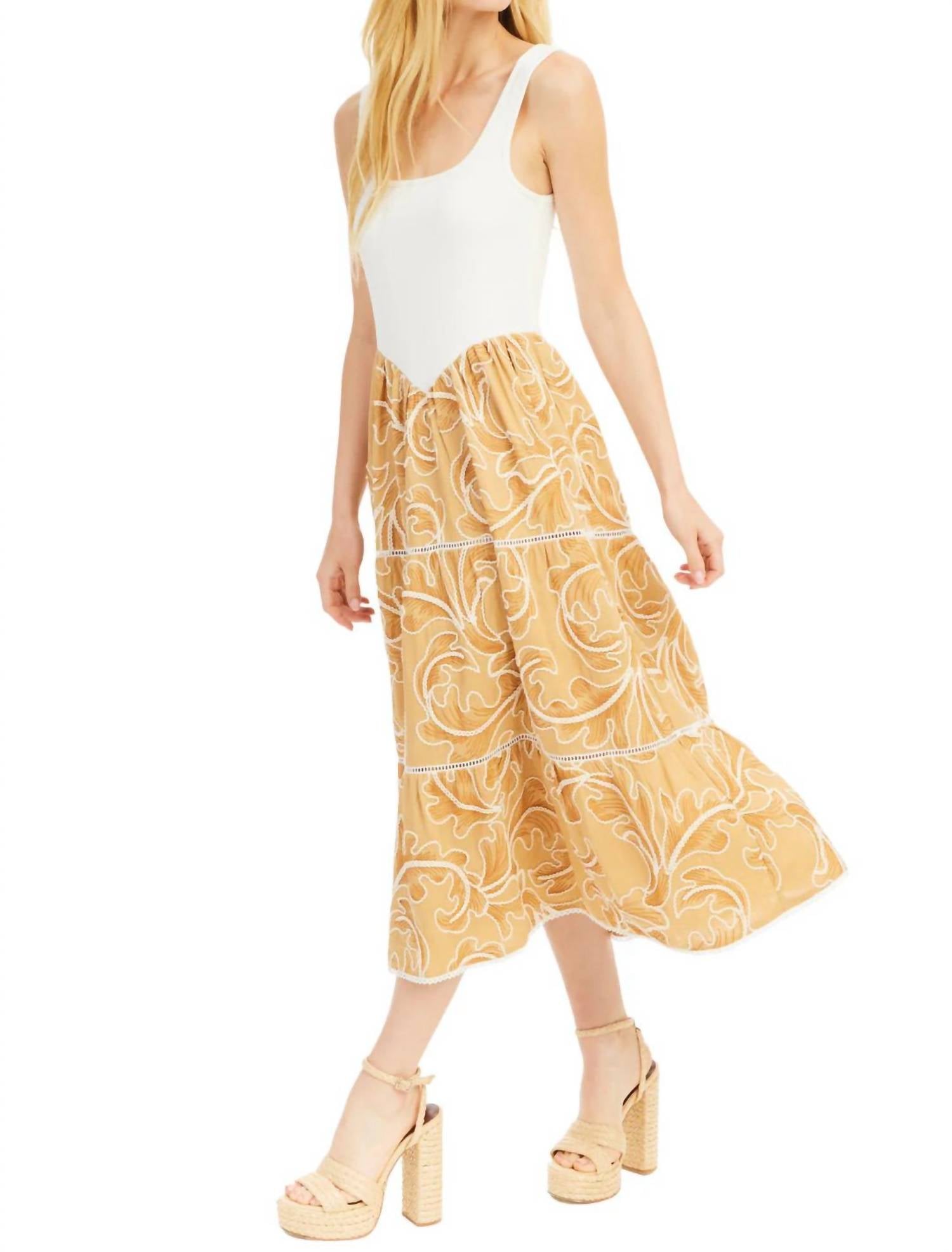A midi dress so versatile, your options for wearing it are endless. Introducing the Giselle Dress by ALLISON NEW YORK, a stunning Tuscan Tan garment ideal for spring engagements with a feminine floral pattern. This sleeveless midi dress is crafted from rayon, featuring a scoop neckline and a distinctive A-line silhouette. It offers a perfect fit with a tight stretch knit bodice and a flowy embroidered skirt adorned with lace inserts, completing the look with a pull-on design. For garment maintenance, it should be dry cleaned.