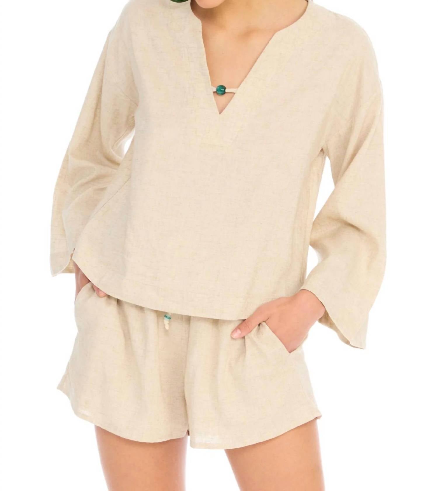A timeless blouse that will never go out of style. The Chiara Top by ALLISON NEW YORK embodies minimalistic chic with its long sleeves and relaxed fit. Crafted from a viscose material blend, this top in beige features a deep split V-neckline embellished with a marbleized teal bead. Perfect for vacation wear, this blouse is a pull-on style making it ideal for effortless summer styling. Care for this solid-patterned piece is simple: machine wash.