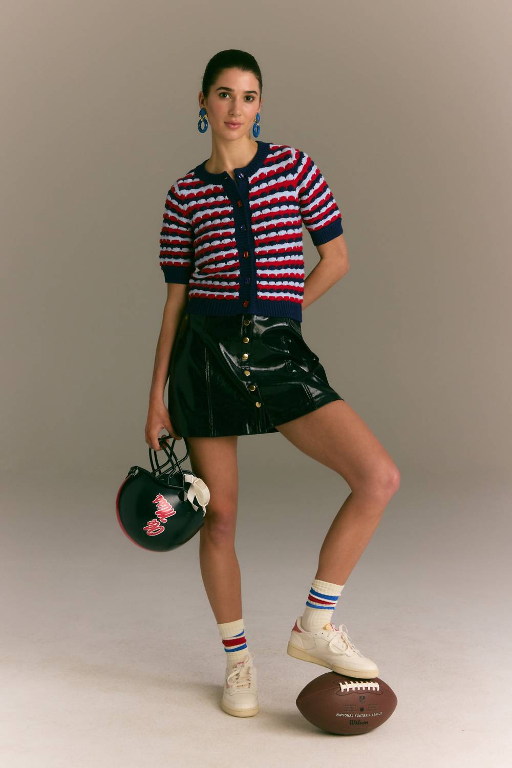 This cardigan will be a sweater-rotation favorite. Discover the Adelle Short Sleeve Cardigan by ALLISON NEW YORK, a charming addition to your wardrobe with its eye-catching navy and red stripe pattern. This women's cardigan is crafted from a viscose blend comprising 45% Viscose, 28% Polyester, and 27% Nylon, offering a lightweight yet elegant look ideal for spring and Valentine's Day. Featuring a classic crewneck and convenient button closure, it offers a versatile style perfect for maximalist trends and vacation occasions. Care: Dry clean only.