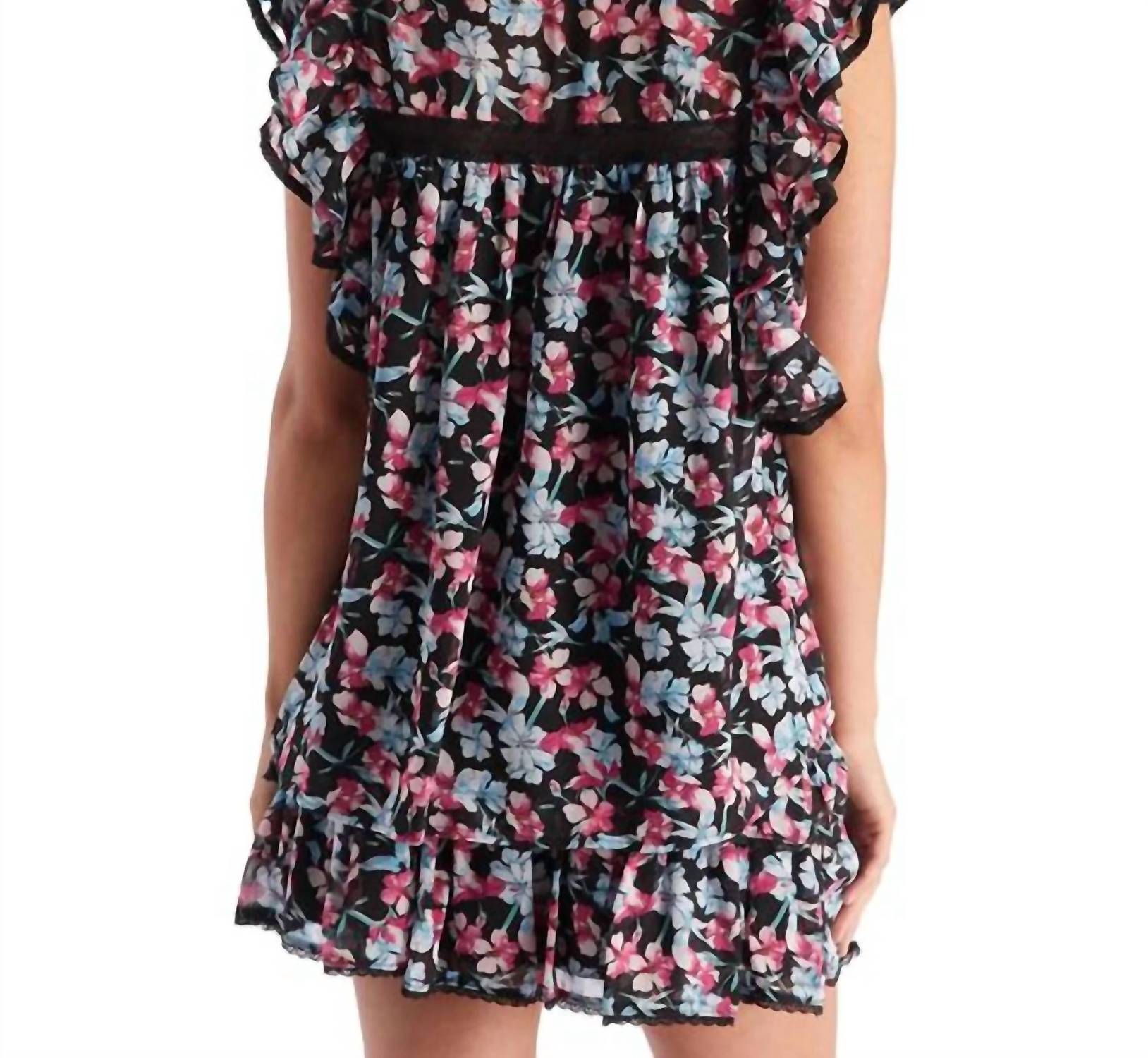 Pair this with your favorite jeans and slides for your next girls night out. Experience timeless elegance with the Willow Top by ALLISON NEW YORK, featuring a vibrant black floral print that's sure to turn heads. This sleeveless blouse is designed with a pull-on closure, contrasting lace detailing, and a cascading ruffle along the arm opening and shoulders for a touch of romance. The loose fit is fully lined, and it boasts a bust measurement of 38 inches and a body length of 23 inches. Crafted for easy care, simply hand wash to maintain its beauty.