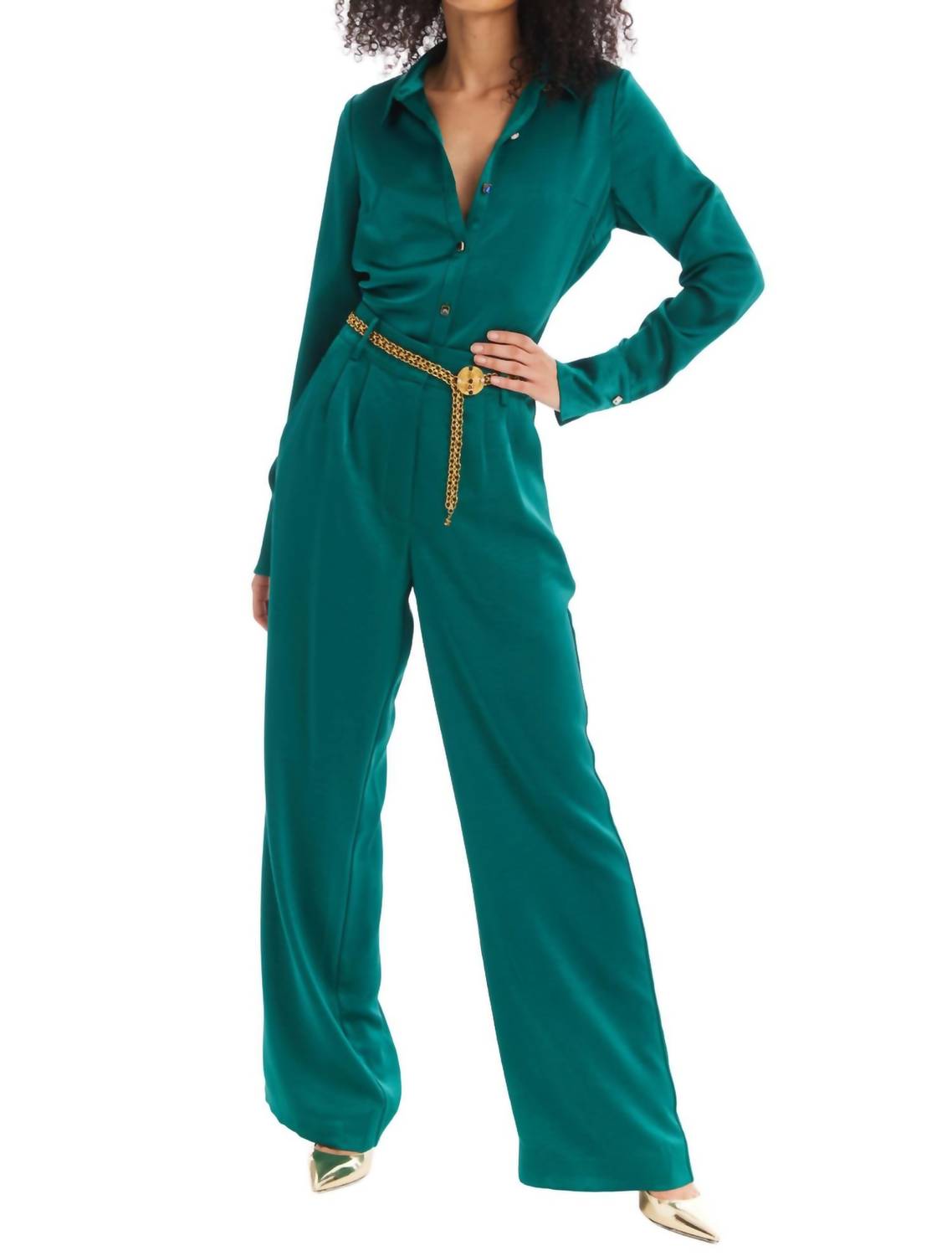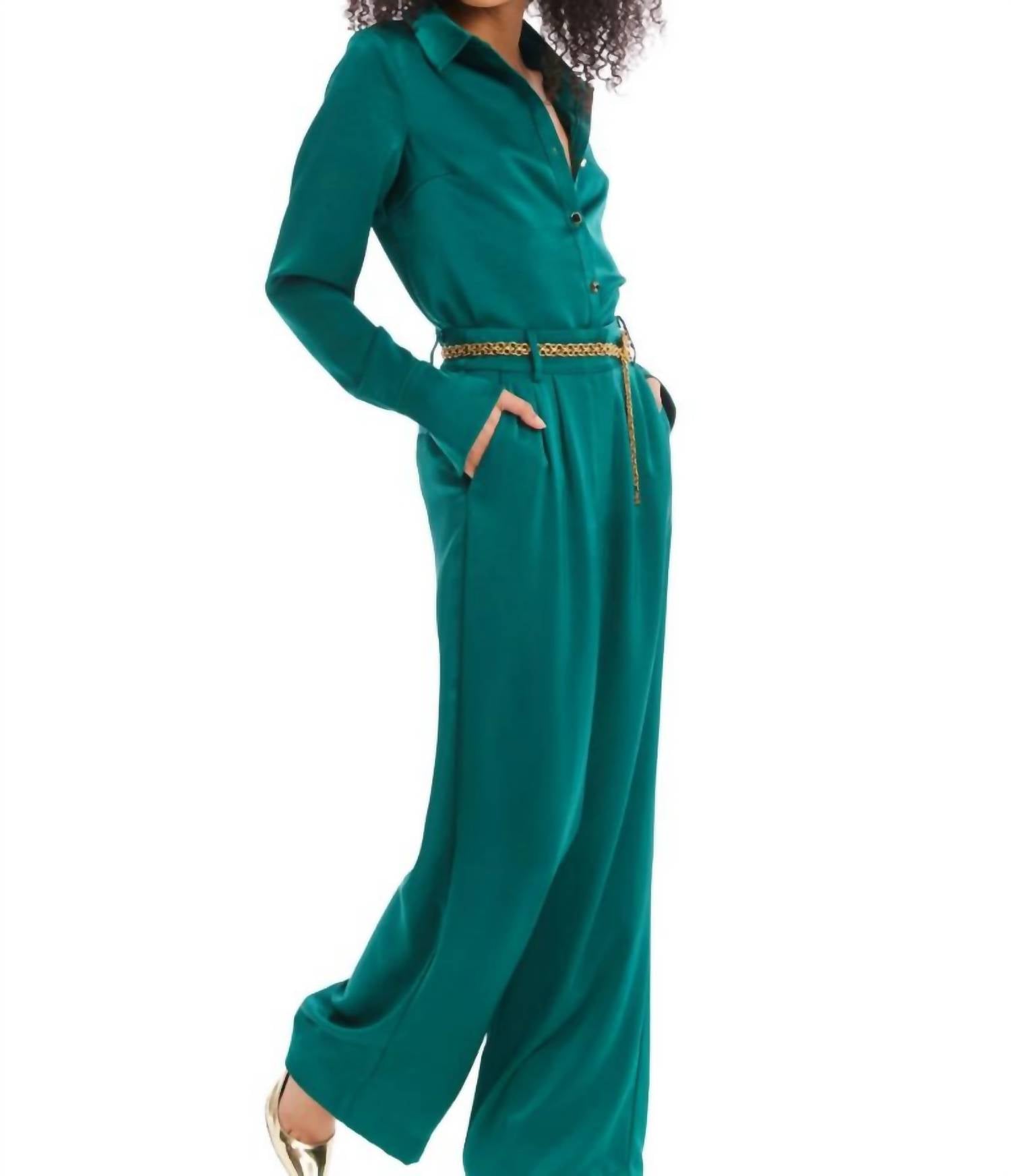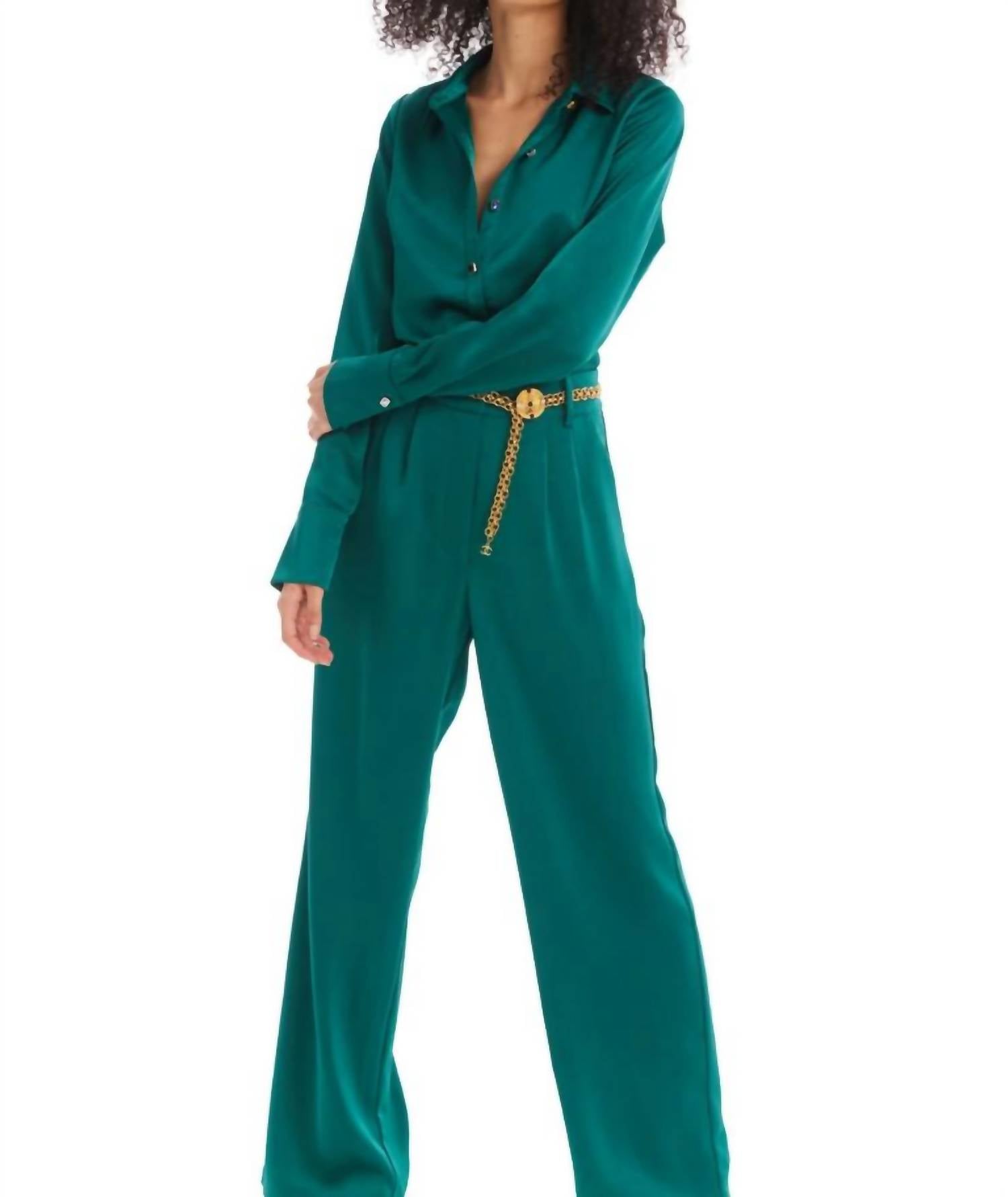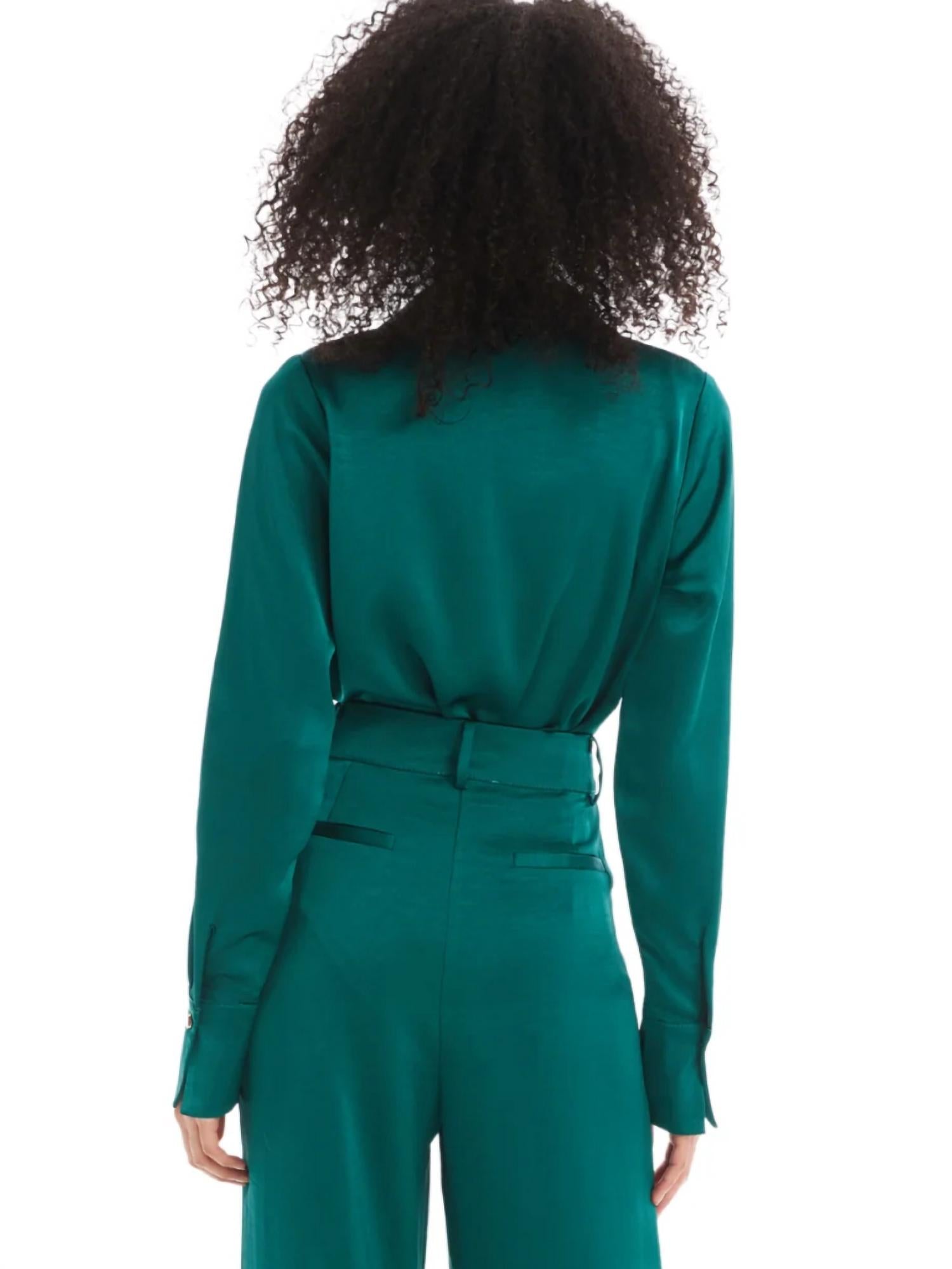 This button down shirt is comfortable yet polished. Introducing the Rhinestone Button Down Top by ALLISON NEW YORK, a statement piece crafted for holiday celebrations. With its long sleeves and striking rhinestone buttoned cuffs, this top is made from luxurious cotton in an eye-catching emerald shade. It features a classic collar and button closure for a timeless appeal, offering a slightly slim fit through the body. Care instructions: Hand wash and lay flat to dry. Ideal for St. Patrick's Day festivities, it embodies quiet luxury.