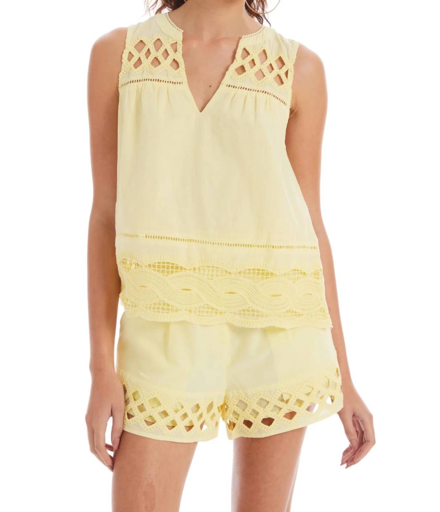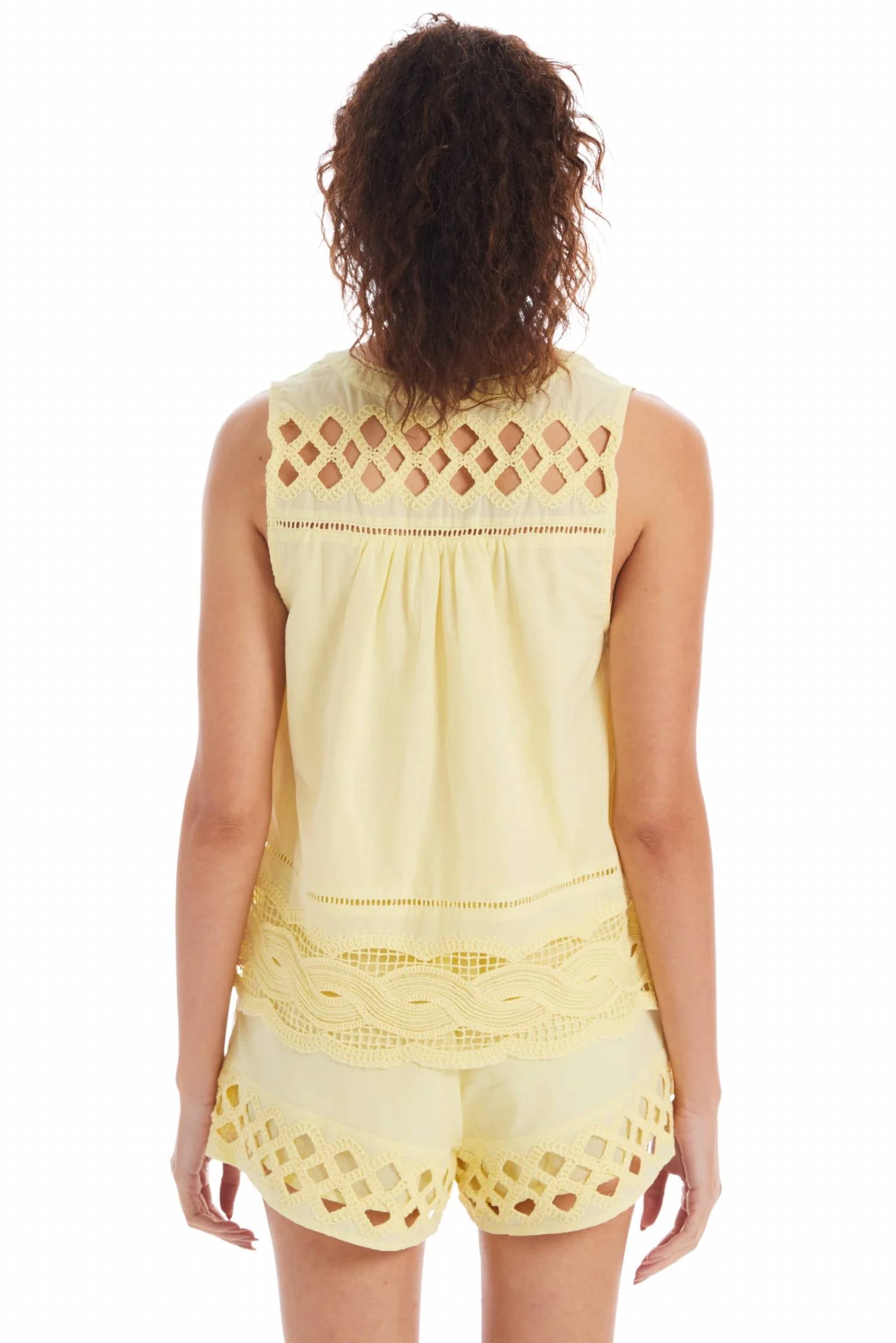 This classic tank top is perfect for layering and cute enough to wear on its own. Elevate your summer wardrobe with the Avery Tank Top by ALLISON NEW YORK in a refreshing buttery yellow hue. This sleeveless, loose-fitting tank features delicate embroidery and a chic split V-neckline, making it perfect for warm days. Made entirely from 100% cotton and fully lined, this pull-on piece ensures comfort and style. Garment length measures 23.5 inches, and care is simple with dry clean only instructions.