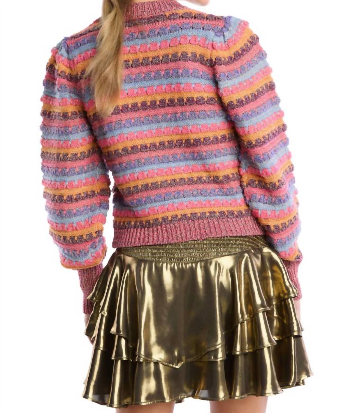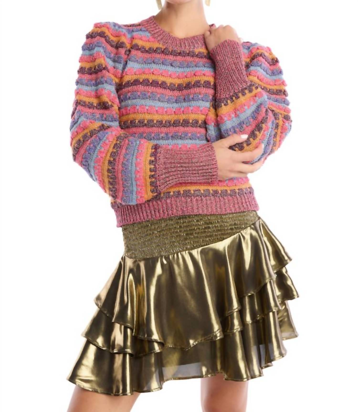 With a hint of metallic throughout. Designed with a fancy bubble knit, space-dye crew neck and slightly cropped body. 64% Polyester, 25% Viscose, 11% Nylon. Hand wash, lay flat to dry or dry clean. Fits true to size. Slightly fitted and cropped length. Measurements: Length: 18 1/2" | Bust: 33" | Sleeve Length: 24 1/2". Model is 5'9" and wearing a size Small.