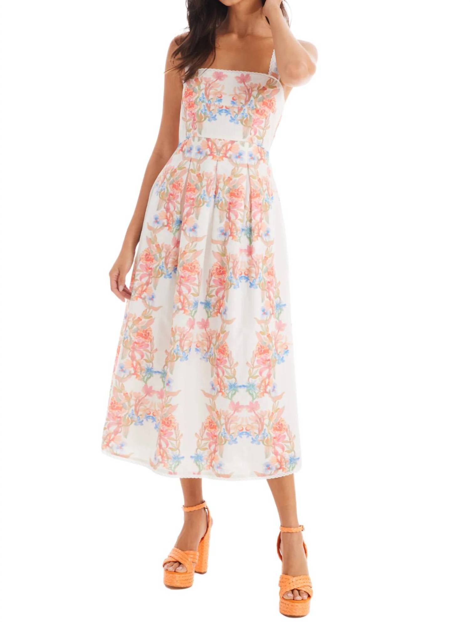 A midi dress so versatile, your options for wearing it are endless. Elevate your vacation wardrobe with the Julianna Midi Dress by ALLISON NEW YORK in the captivating Floral Arches pattern. This sleeveless, A-line silhouette dress boasts a charming square neckline and is crafted from a breathable cotton blend with 64% Cotton and 36% Linen, finished with delicate crochet trims. Designed for ultimate comfort, it features adjustable wide straps with a smocked back bodice for a perfect fit and a functional zip closure. With a garment length of 48 inches and added convenience of pockets, it's fully lined and finished with inverted pleats; simply hand wash and lay flat to dry for care.