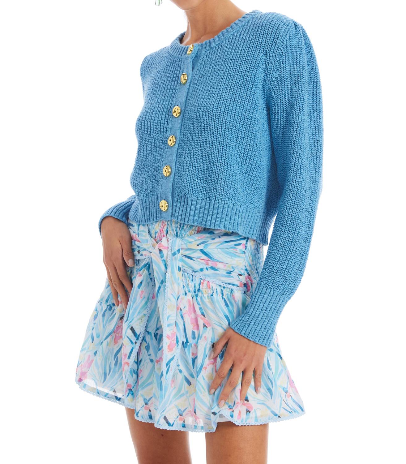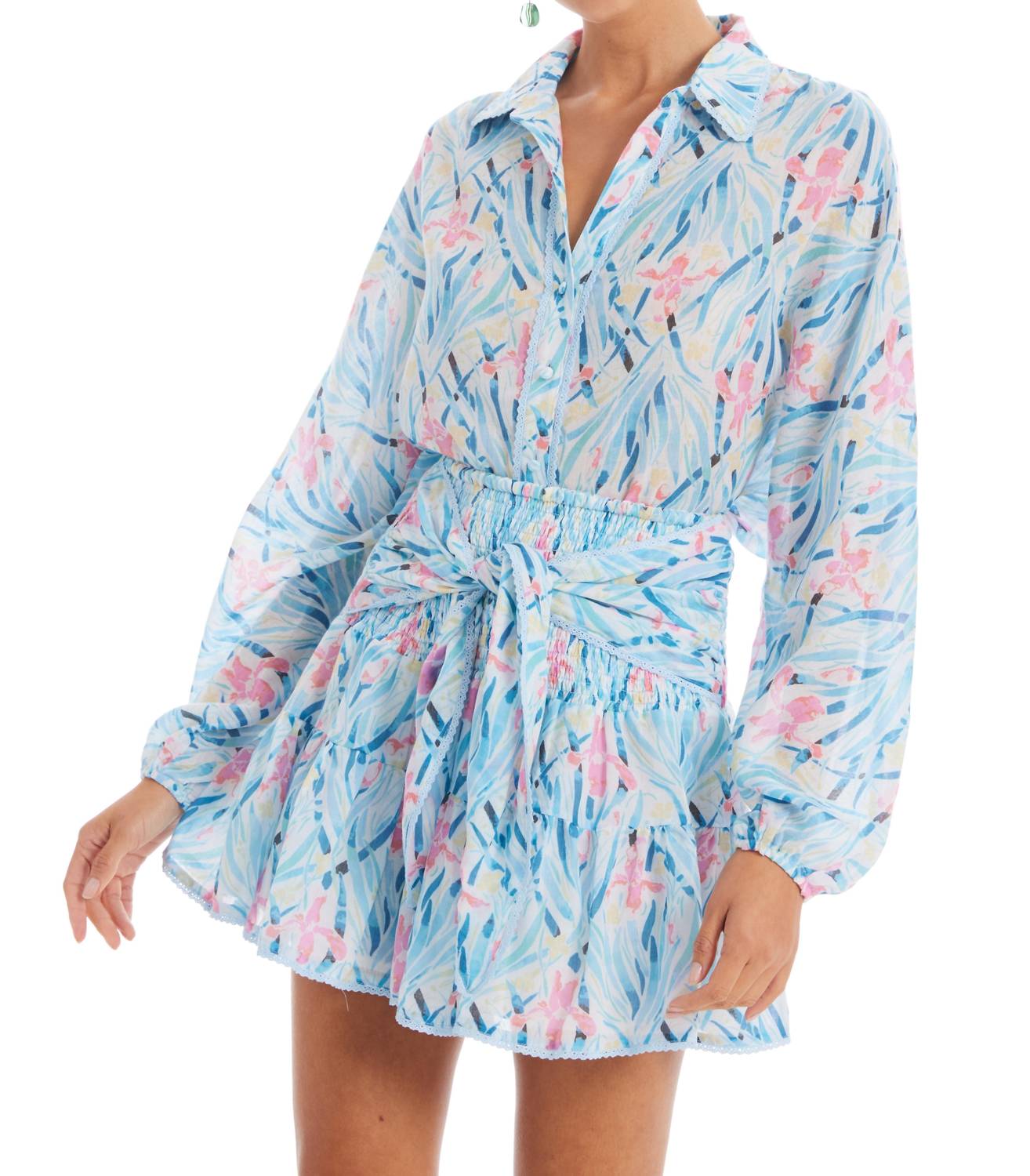 Tuck in your favorite tee for a more laid-back vibe. Introducing the Chase Iris Mini Skirt by ALLISON NEW YORK, a charming addition to any wardrobe with its vibrant floral print. Crafted from airy cotton, this boho chic piece features a flattering smocked waistband, hip tie detail, and a flouncy ruffled hem adorned with delicate crochet trim. Designed for ease, this pull-on skirt is fully lined for comfort and effortless wear throughout the summer season. Care instructions recommend machine wash and line dry.