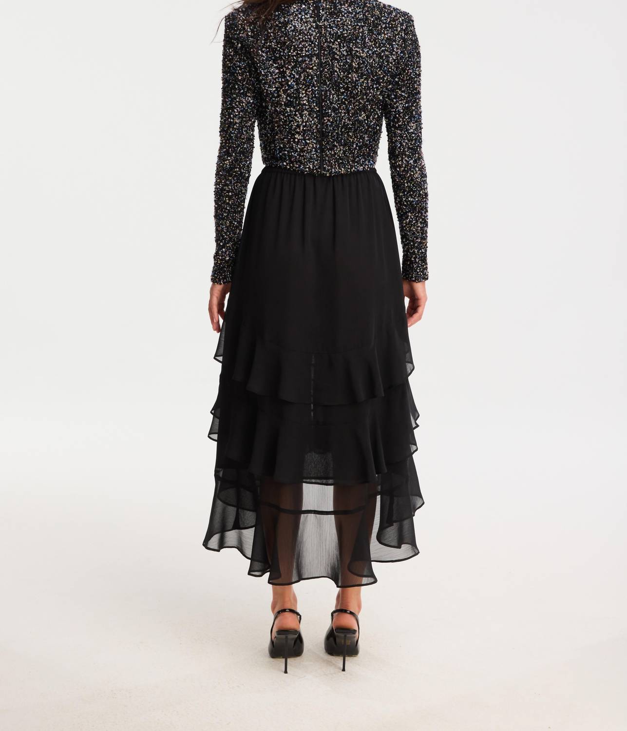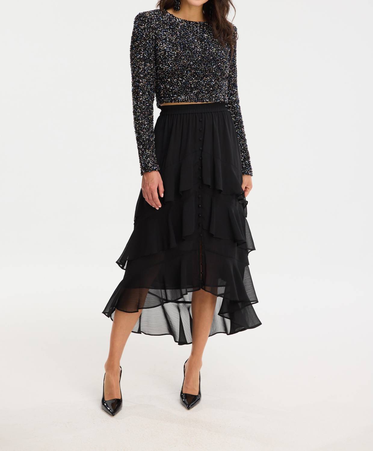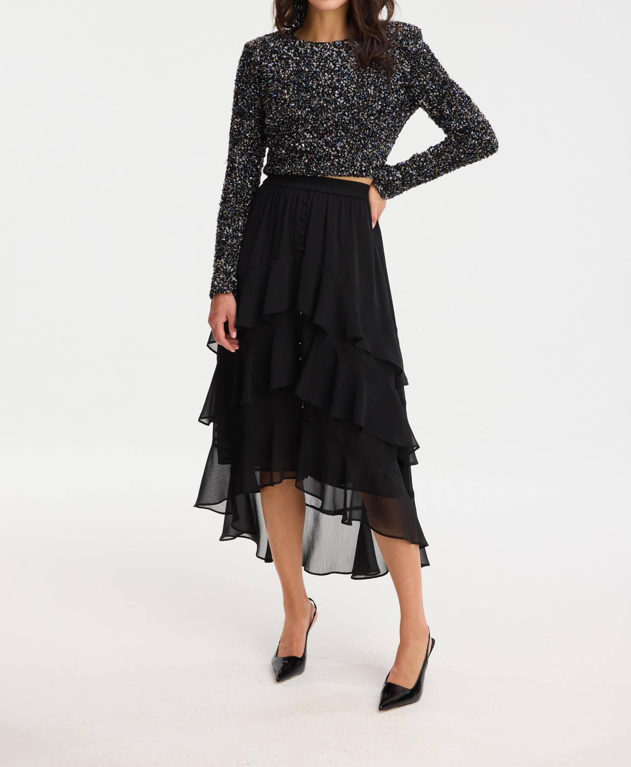 Show off just the right amount of skin in this beautifuly designed midi length skirt. Elevate your wardrobe with the Ella Midi Skirt by ALLISON NEW YORK, a chic, minimalist piece in classic black. Featuring a solid pattern and a flattering silhouette, this skirt effortlessly adapts to various occasions, particularly ideal for cocktail parties. Garment Length: Midi. Season: Spring. Keep your style timeless and versatile with this essential piece.