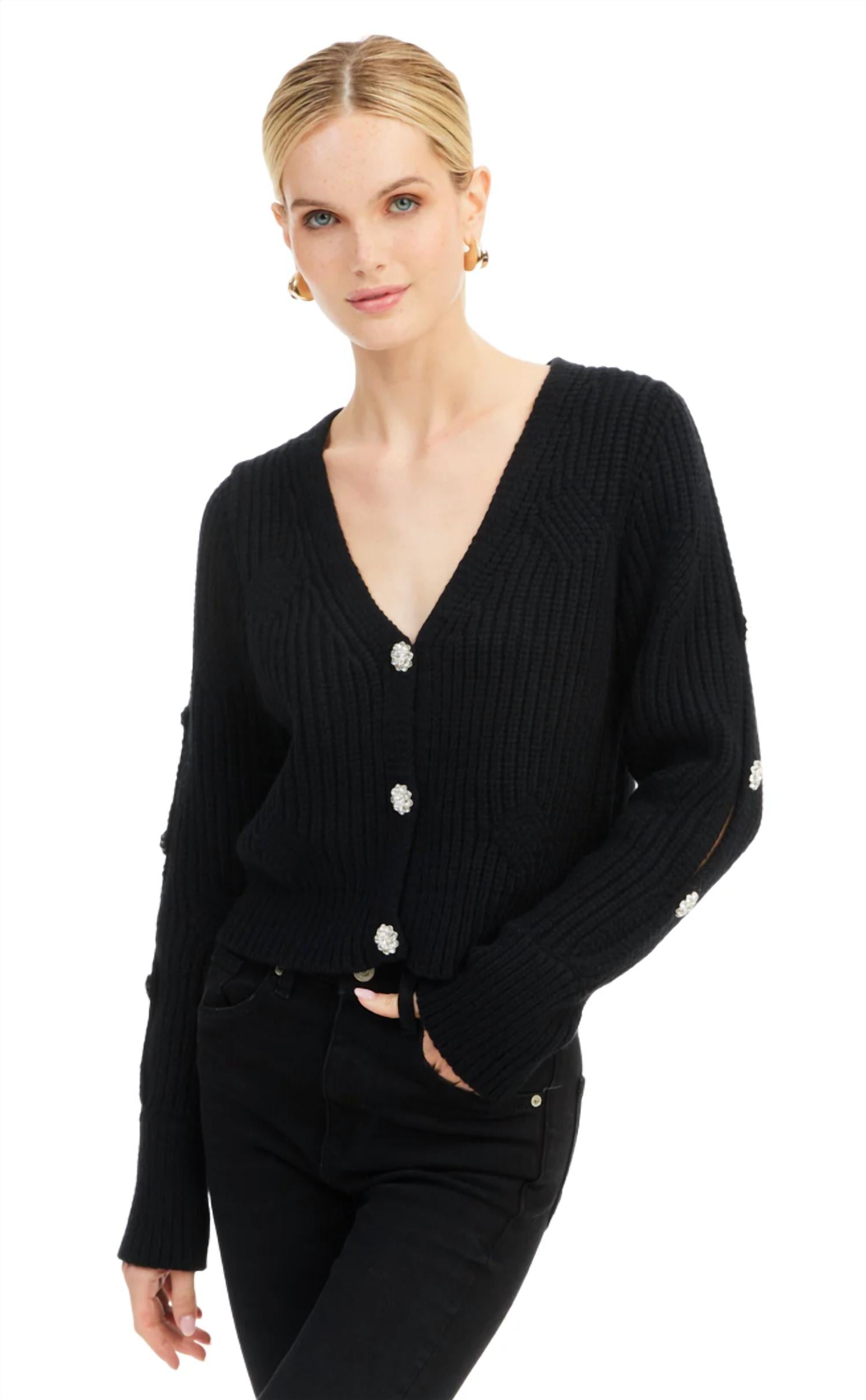 This cardigan will be a sweater-rotation favorite. Elevate your fall wardrobe with the Jeweled Cardigan by ALLISON NEW YORK, a stylish addition for any occasion. This sophisticated black cardigan features long sleeves adorned with fixed crystals and chic peek-a-boo slits. With a deep V-neckline and crystal button closure, it presents a slightly cropped design that is perfect for festive celebrations or workwear ensembles. Crafted for women, it requires hand washing to maintain its elegant appearance.
