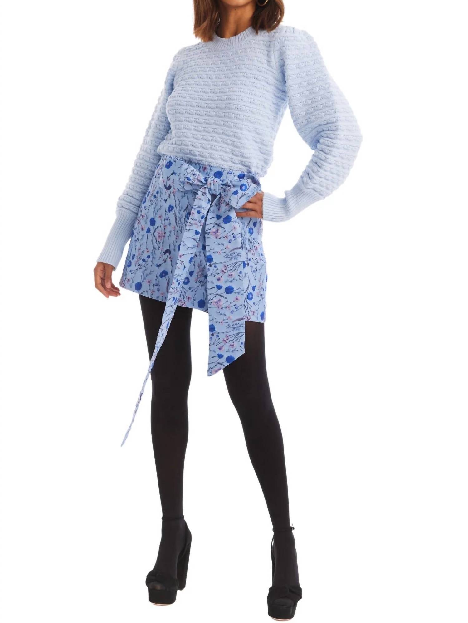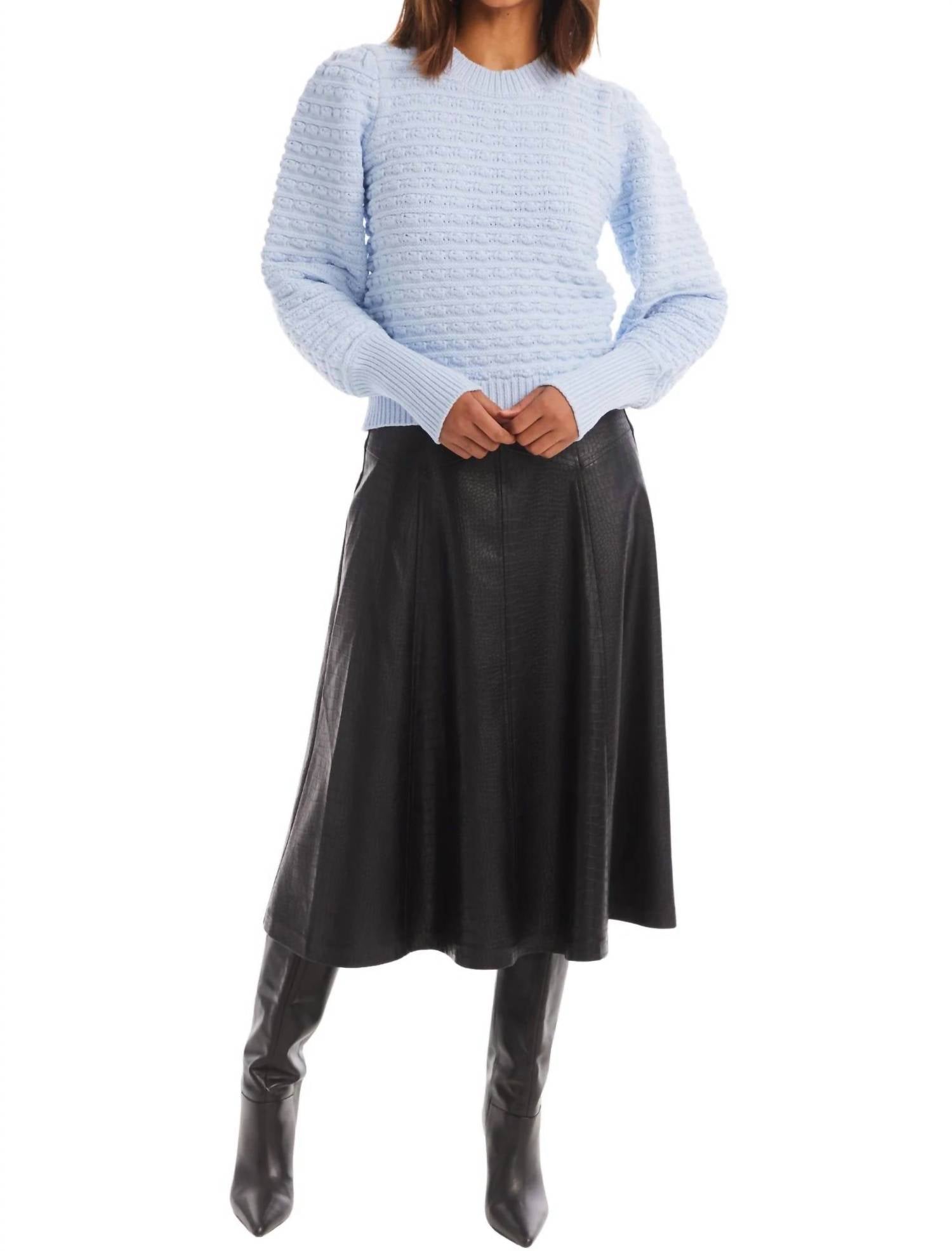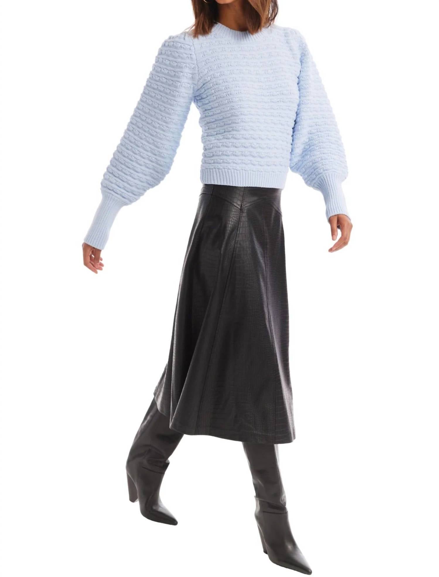 The Solid Adelle Sweater by ALLISON NEW YORK is a preppy, sky blue addition to any wardrobe. Featuring long balloon sleeves with pleated shoulders and an elongated fitted cuff, this slightly cropped sweater is designed with a fitted body and crew neckline. Crafted from a blend of 50% Viscose, 30% Nylon, and 20% Polyester, it offers a luxurious feel. Closure: Pull-on. Care: Dry clean only. With a garment length of 19 inches, a bust of 16 inches, and a sleeve length of 25 inches, it is perfect for evening events or Thanksgiving celebrations.