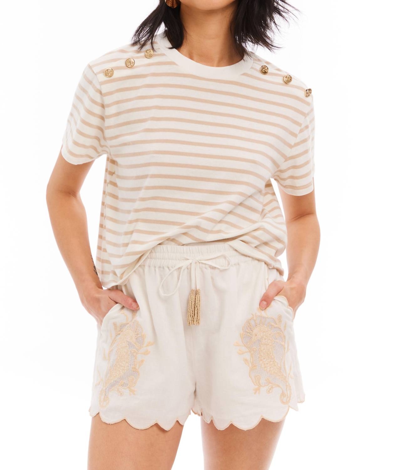 This classic, short sleeve tee will be your go-to staple this season and beyond. The Allison New York Stripe Brooklyn Tee in Sand Stripe is a chic addition to any summer wardrobe. Crafted from 100% Cotton, this short sleeve tee offers breathable comfort and a classic crewneck design. Featuring a pull-on closure and stylish gold button detail, it effortlessly combines workwear trend with holiday party charm. Care instructions include hand washing and line drying, perfect for maintaining its timeless appeal.