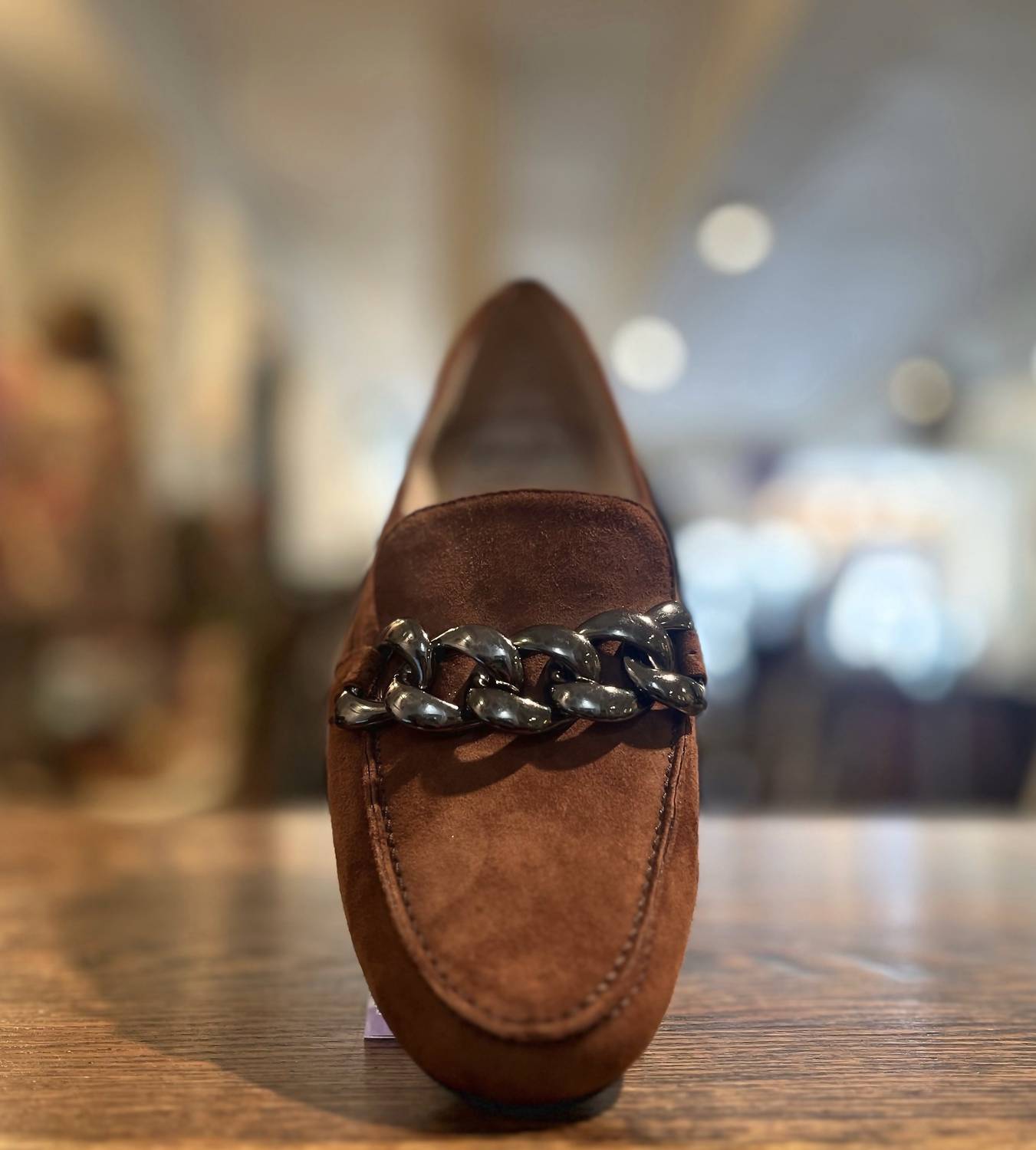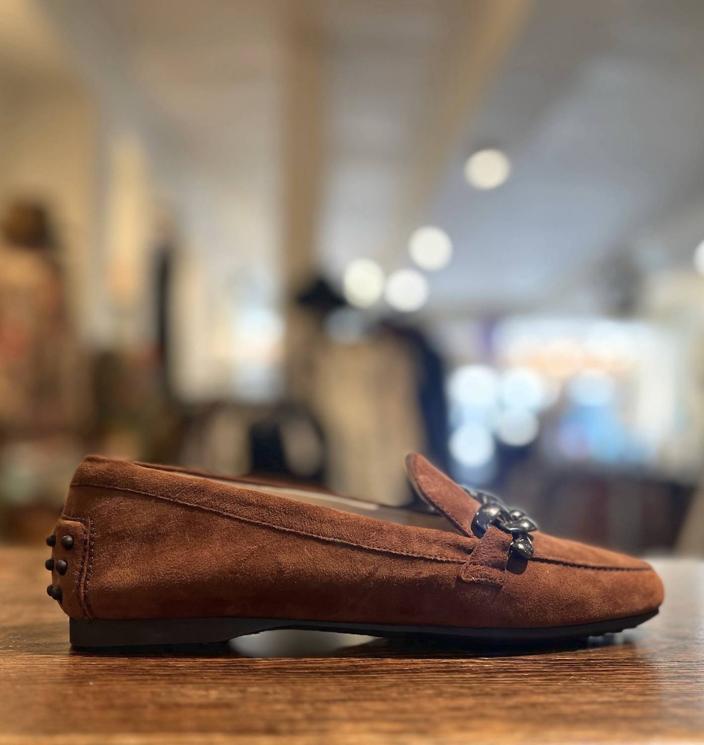 Suede upper. Chain strap detail. Slip on. Leather lining. Memory foam comfort insole. Rubber outsole. Driver heel counter. Approx. 0.56" heel height. Designed and handcrafted in Italy.