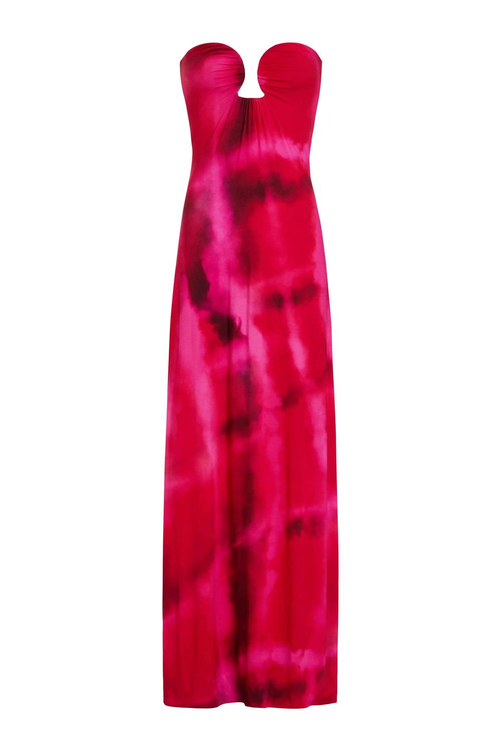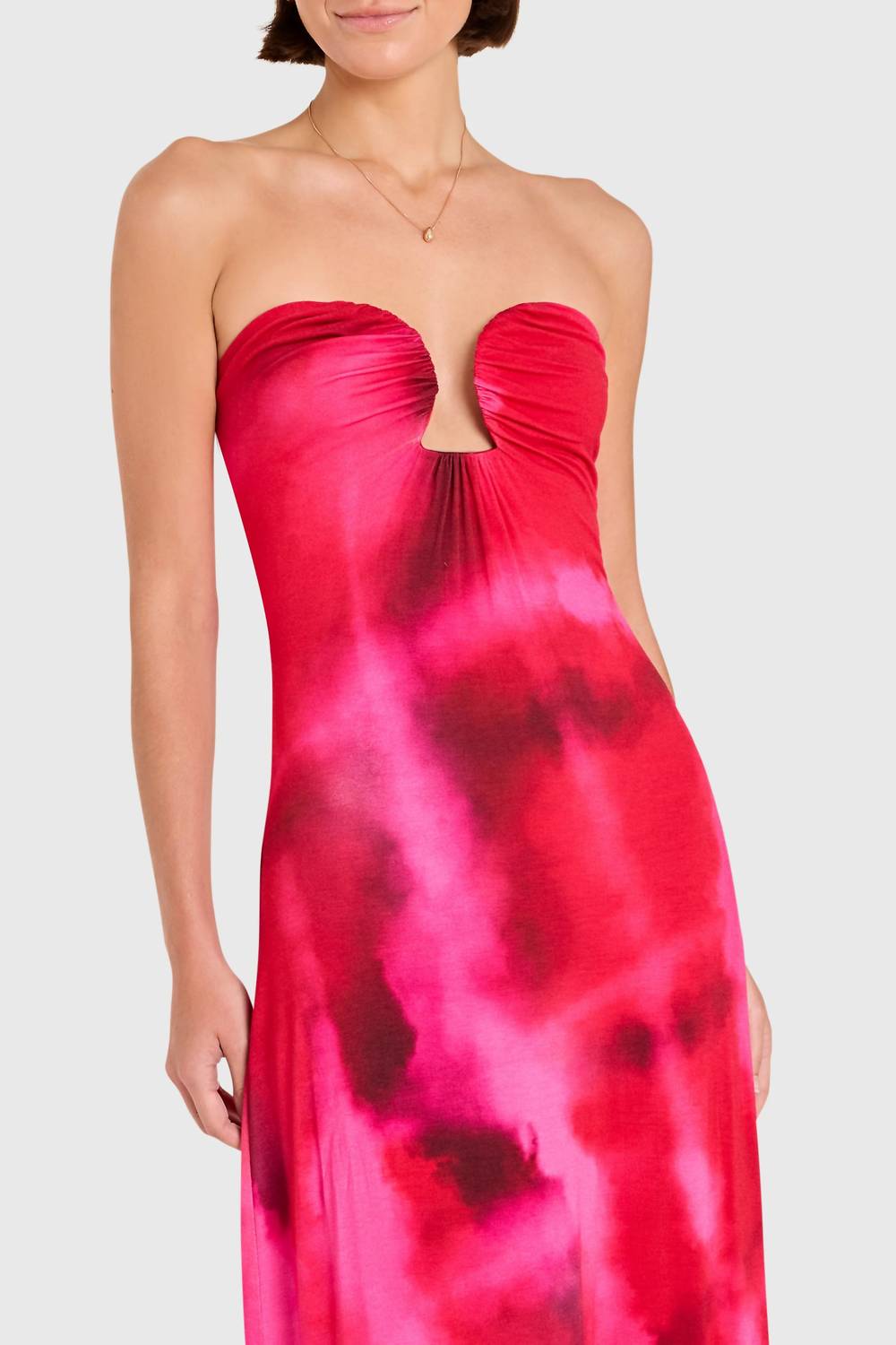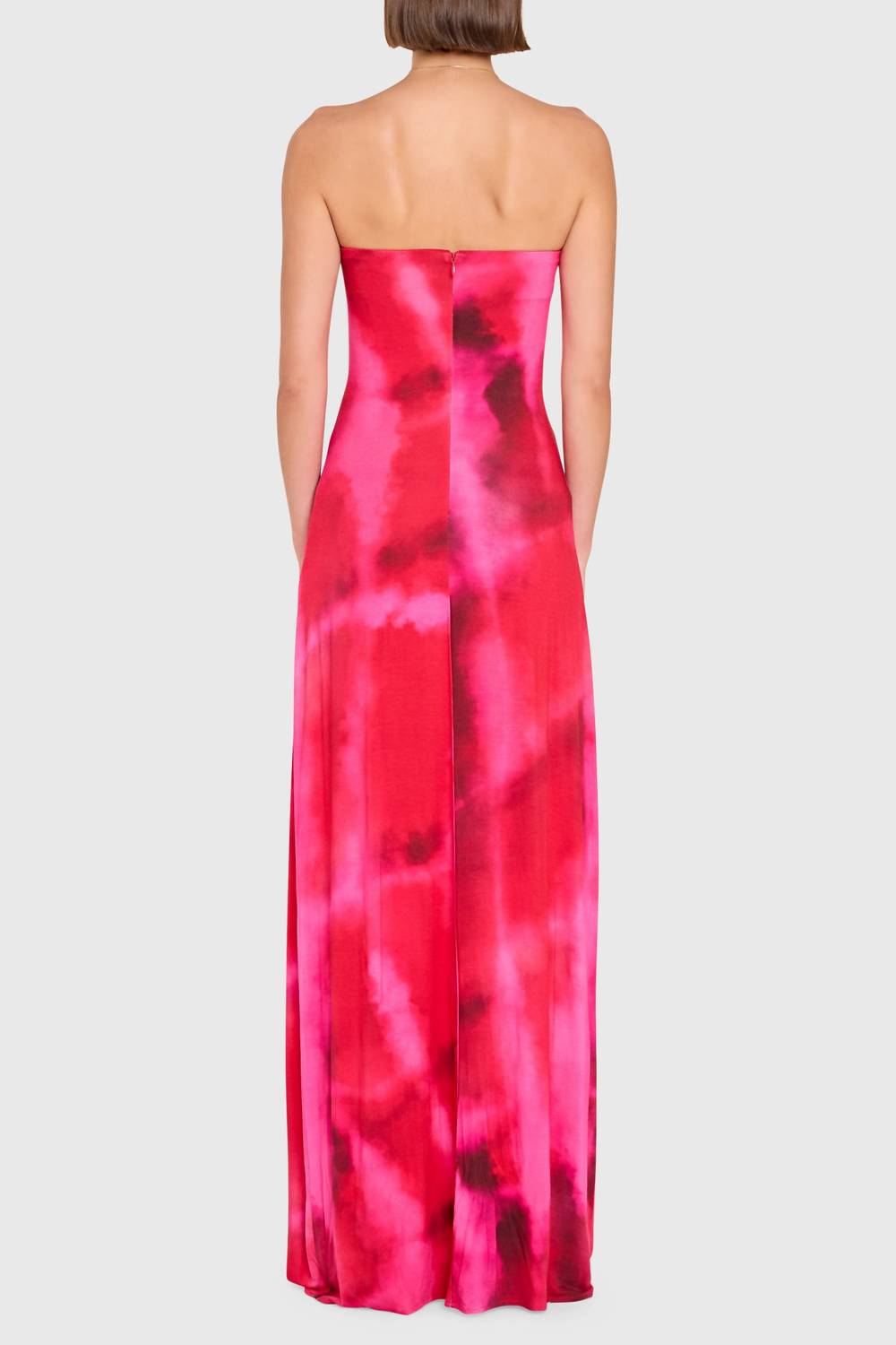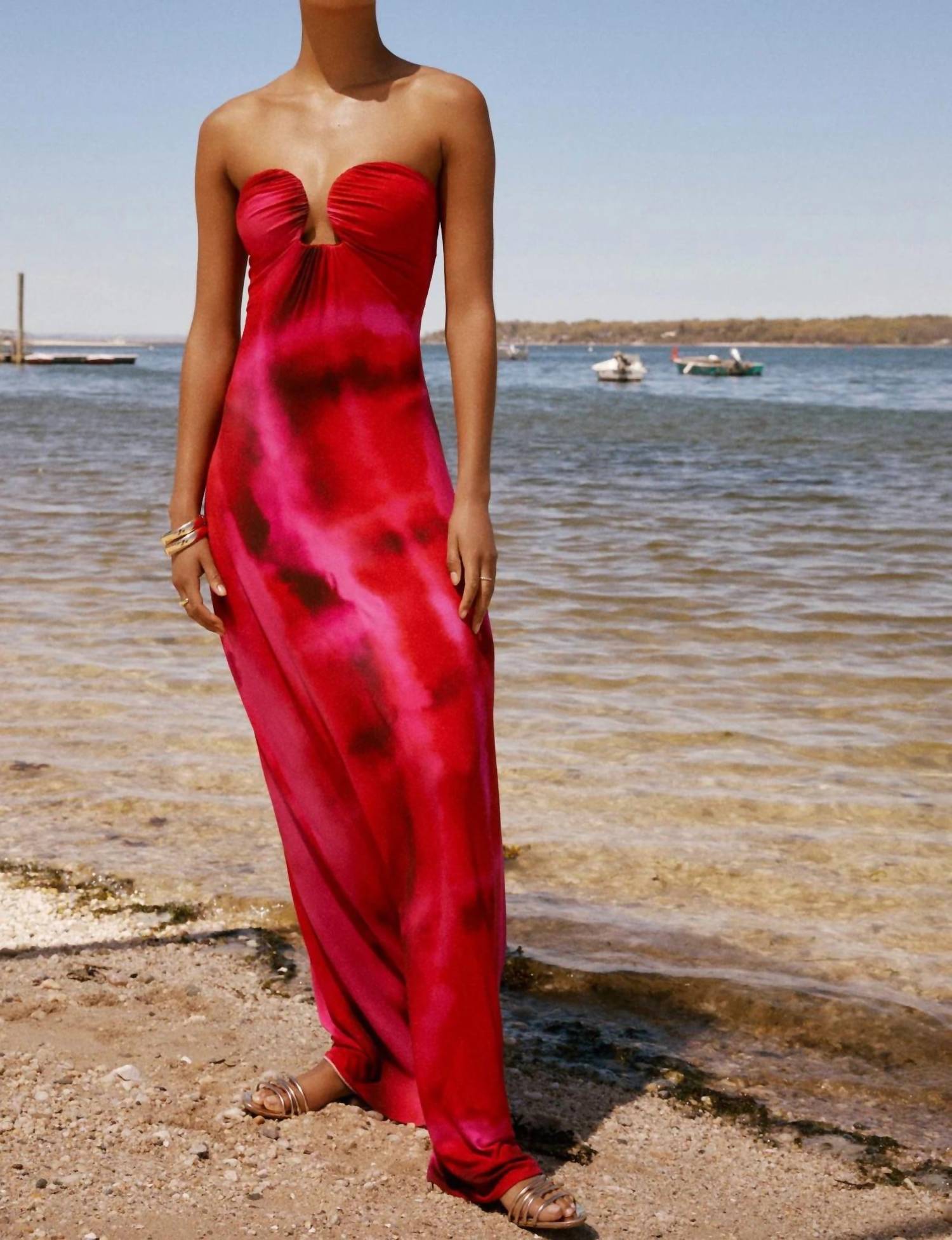 Style this maxi with your favorite statement necklace and sandals for the perfect look. Embrace elegance with the Saladana Maxi Dress by Amanda Uprichard, a stunning choice in Abyss Print for your summer occasions. This full-length dress features a strapless design and a draped bodice, accentuated by a tie-dye pattern that epitomizes the maximalist trend. Crafted from 95% Rayon and 5% Elastane, it offers a sleek sheath silhouette with a discreet invisible zip closure at the center back for a seamless finish. For lasting quality, hand wash and line dry this fully lined dress, making it perfect for events like summer weddings and dinner parties.