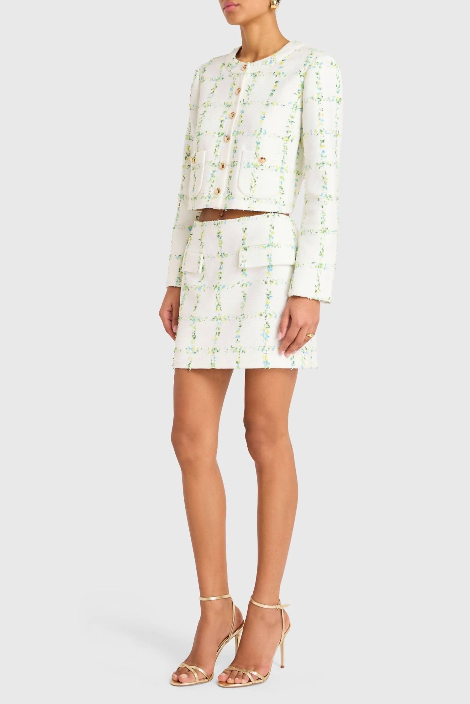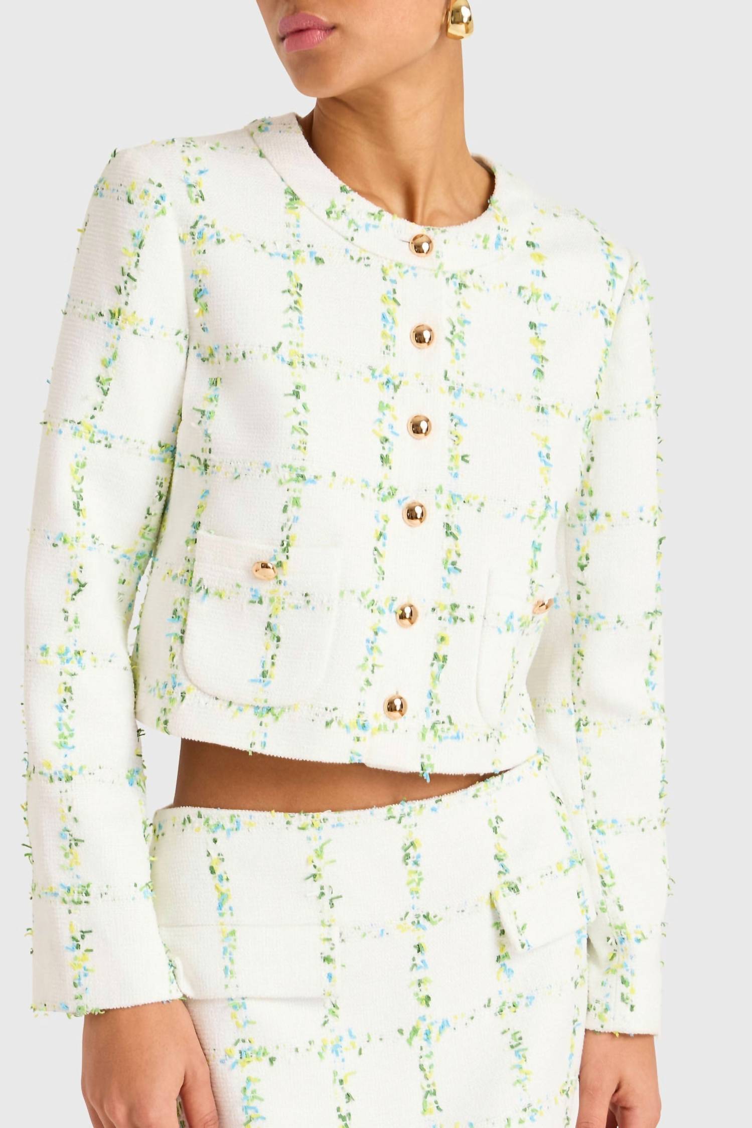 A casual yet cool jacket that every closset needs. Elevate your style with the Maven Jacket by Amanda Uprichard, a sophisticated choice for the modern fashionista. This long-sleeve, cropped statement piece boasts exquisite embroidered floral details and a crewneck, all enhanced by novelty large gold buttons and charming pockets. Crafted from 100% Polyester, this jacket requires dry cleaning to maintain its luxurious finish. Perfect for spring and Thanksgiving, the jacket embodies a quiet luxury trend with its patterned design in white accented by green, blue, and yellow. Closure: Button closure.