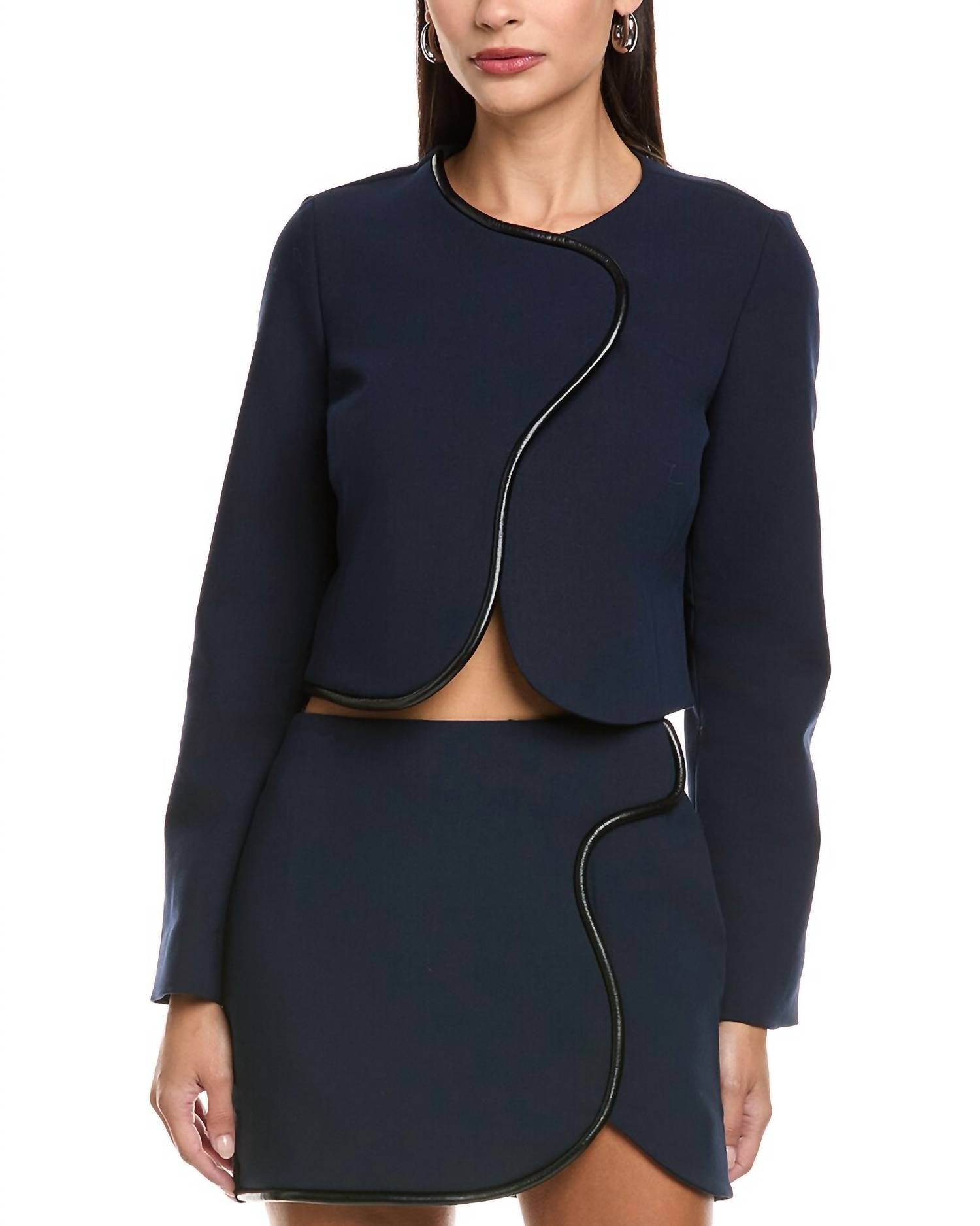 A casual yet cool jacket that every closset needs. Elevate your style with the Andie Jacket by Amanda Uprichard, a sophisticated choice for fall occasions. This navy jacket features a long sleeve design with a classic crewneck, perfect for a dinner party or workwear ensemble. Crafted from 100% polyester with a 100% polyurethane trim, this jacket is tailored for elegance with a button closure. Care: Dry clean only. The jacket measures approximately 15 inches from shoulder to hem and the model is 5'10" wearing a size S.