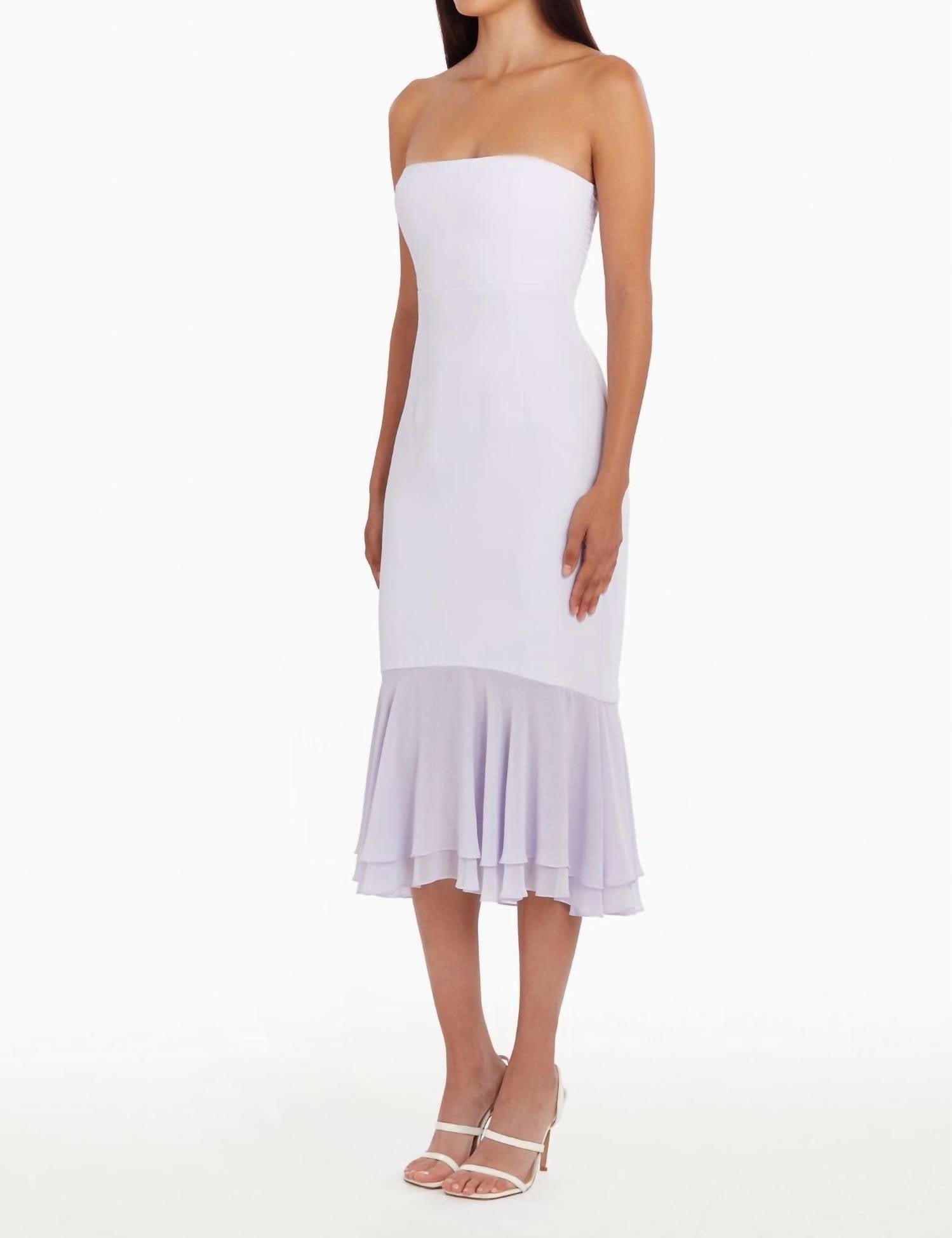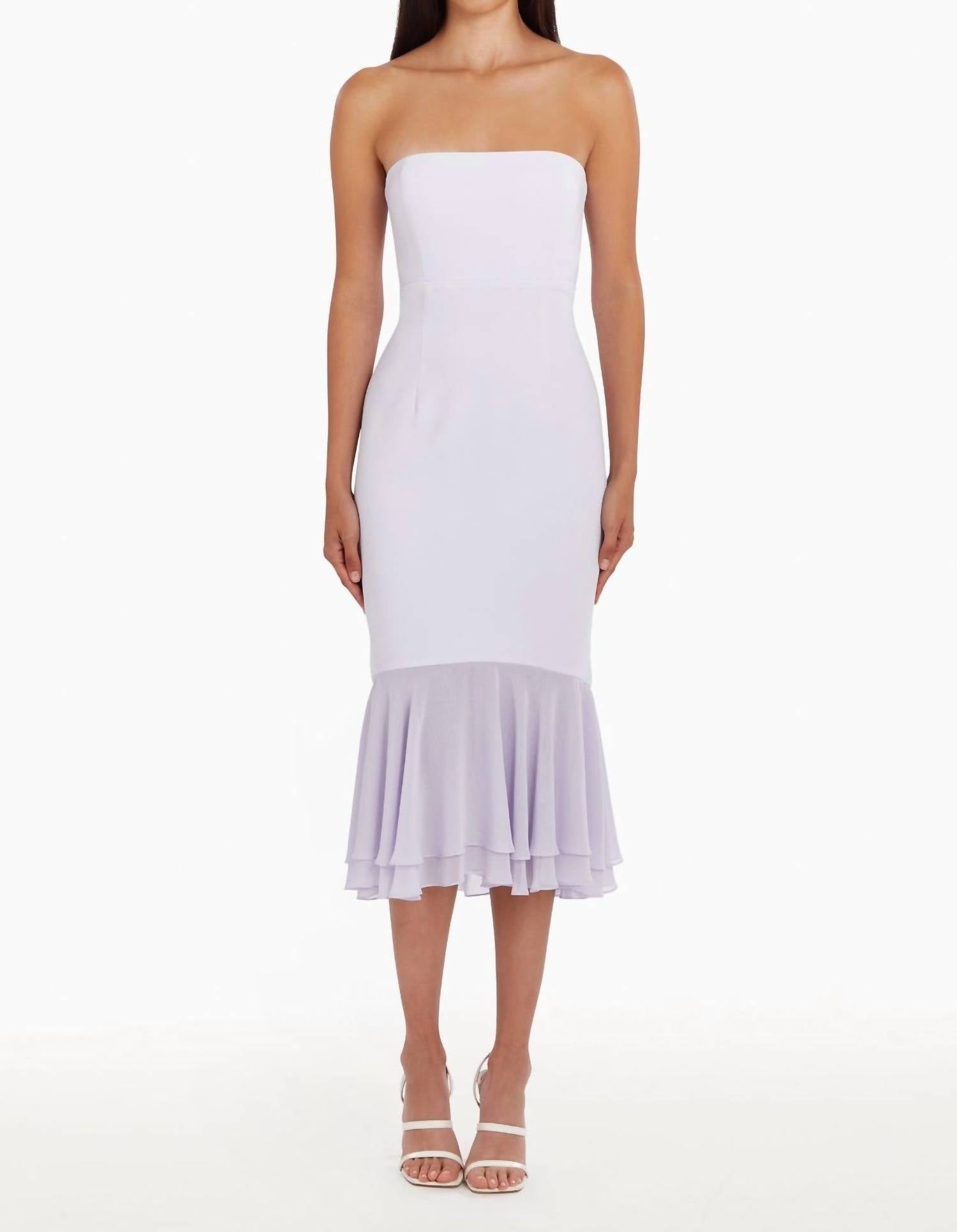 Just add slides or mules and you are good to go. Unveil a new level of elegance with the Jackie Midi Dress by Amanda Uprichard, perfect for evening events and spring occasions. This lilac, strapless A-line dress gracefully flatters your figure while embodying a minimalist trend. Seamlessly transition from day to night with this solid, off-the-shoulder piece, ideal for Thanksgiving gatherings. Closure: Zip closure.