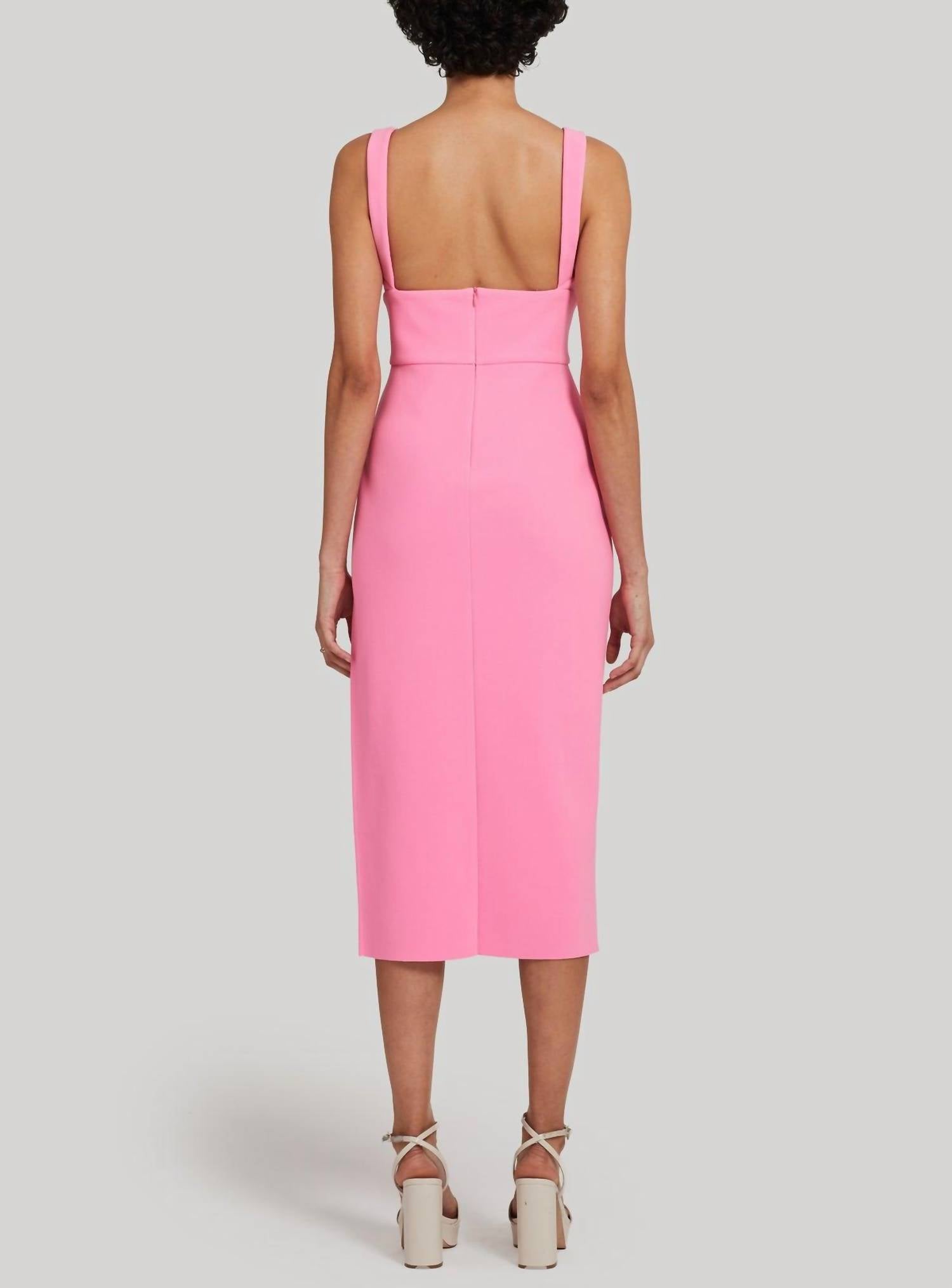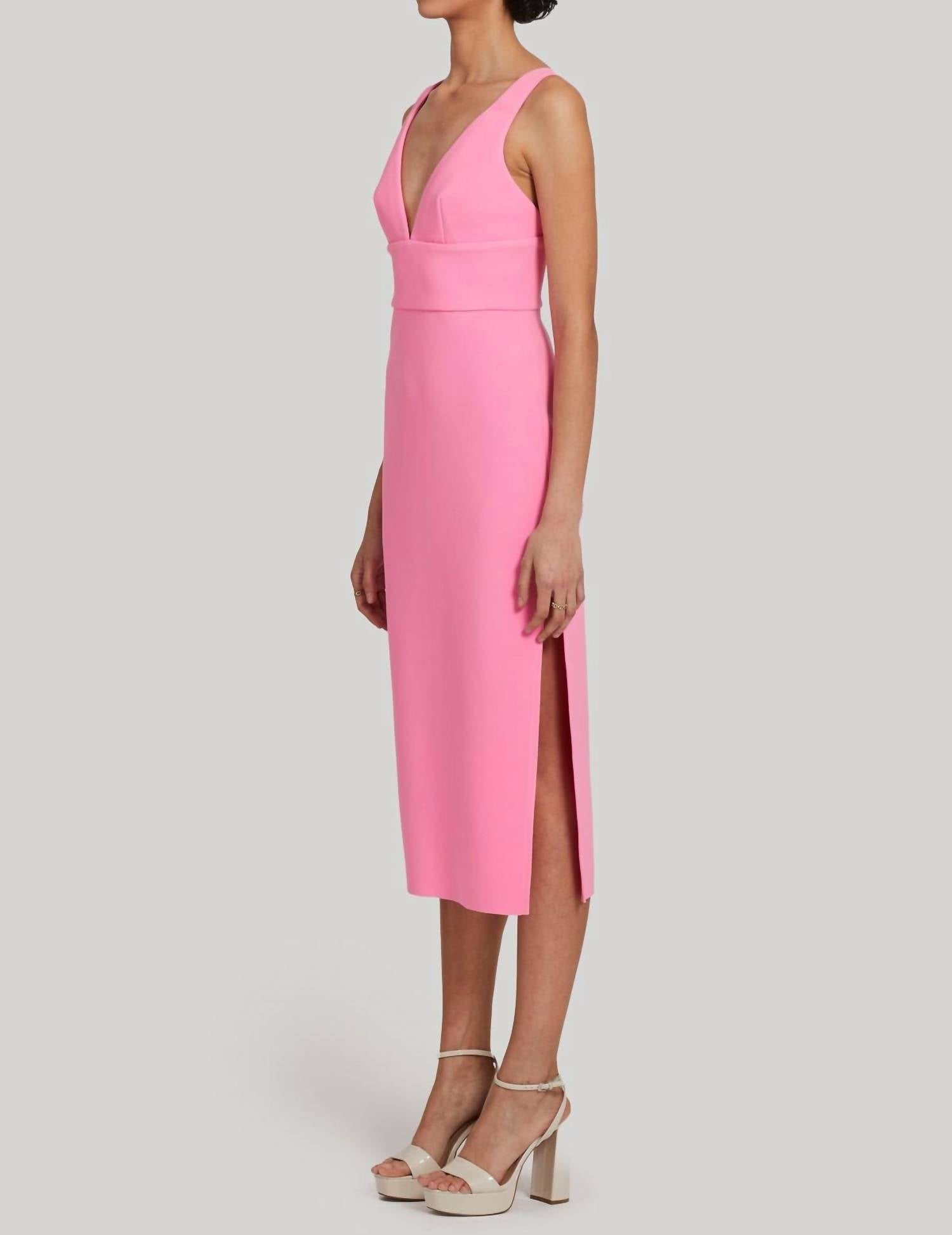 Midi Dress. Unlined. V-Neck, Wide Straps, Side Front Slit. Invisible Back Zipper with Hook and Eye. Dry Clean Only. Model is 5'10”. HPS: 47”