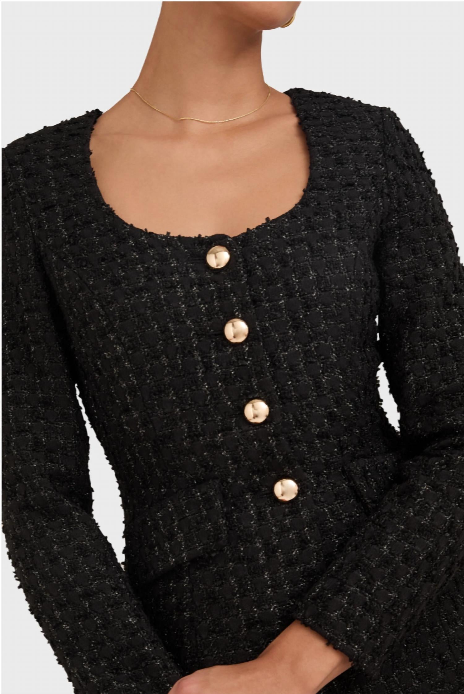 An elevated version of your favorite classic blazer. Elevate your fashion game with the Amanda Uprichard Tweed Kya Romper, a modern piece that combines classic tailoring with a contemporary twist. This textured black romper features a structured top with long sleeves and a timeless, button-up scoopneck design accented with pocket flaps for added style and functionality. Made for sophisticated women, it incorporates a playful touch with its shorts. The romper is styled without a closure and is designed to make a bold statement whether paired with tall boots or elegant pumps.