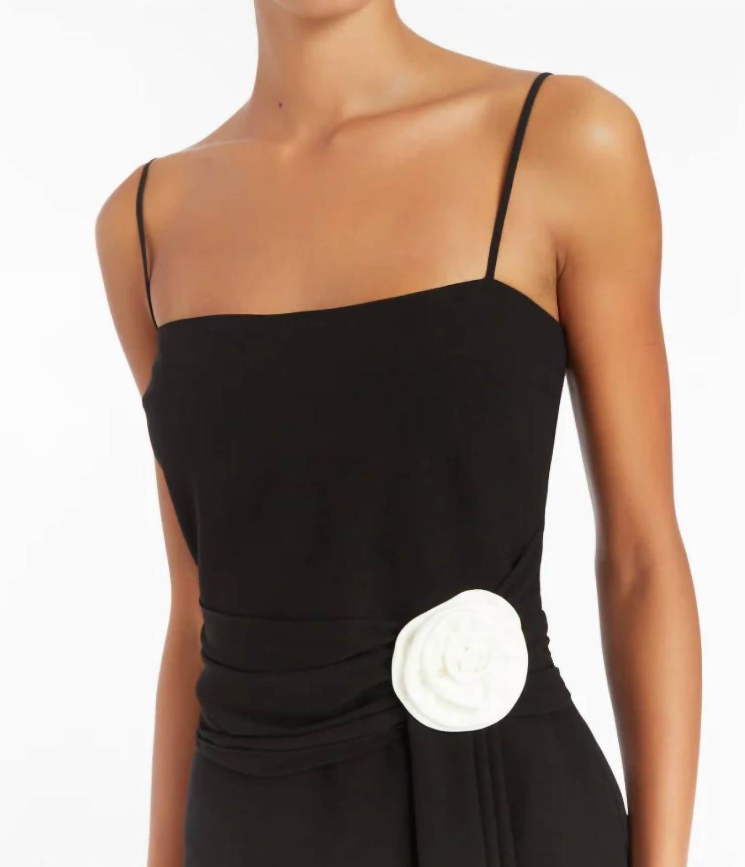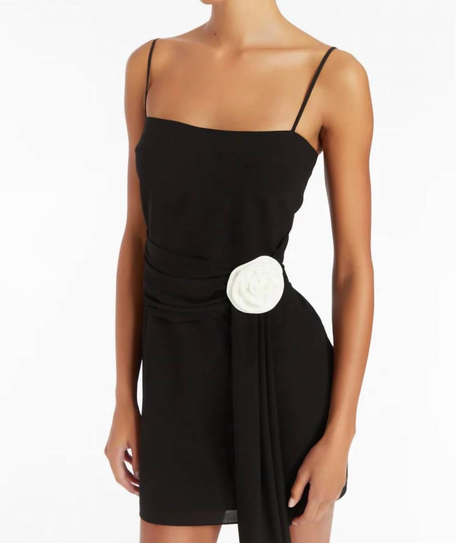 Introducing the Isabel Dress by Amanda Uprichard, a stunning mini dress in timeless black perfect for any occasion. This elegant piece features delicate spaghetti straps and a straight neckline, beautifully accented by an extended sash and rosette detail. The dress is fully lined and crafted from 100% polyester, ensuring a flattering fit with a zip closure for easy wear. Care for this dress by dry cleaning only to maintain its luxurious feel and appearance.