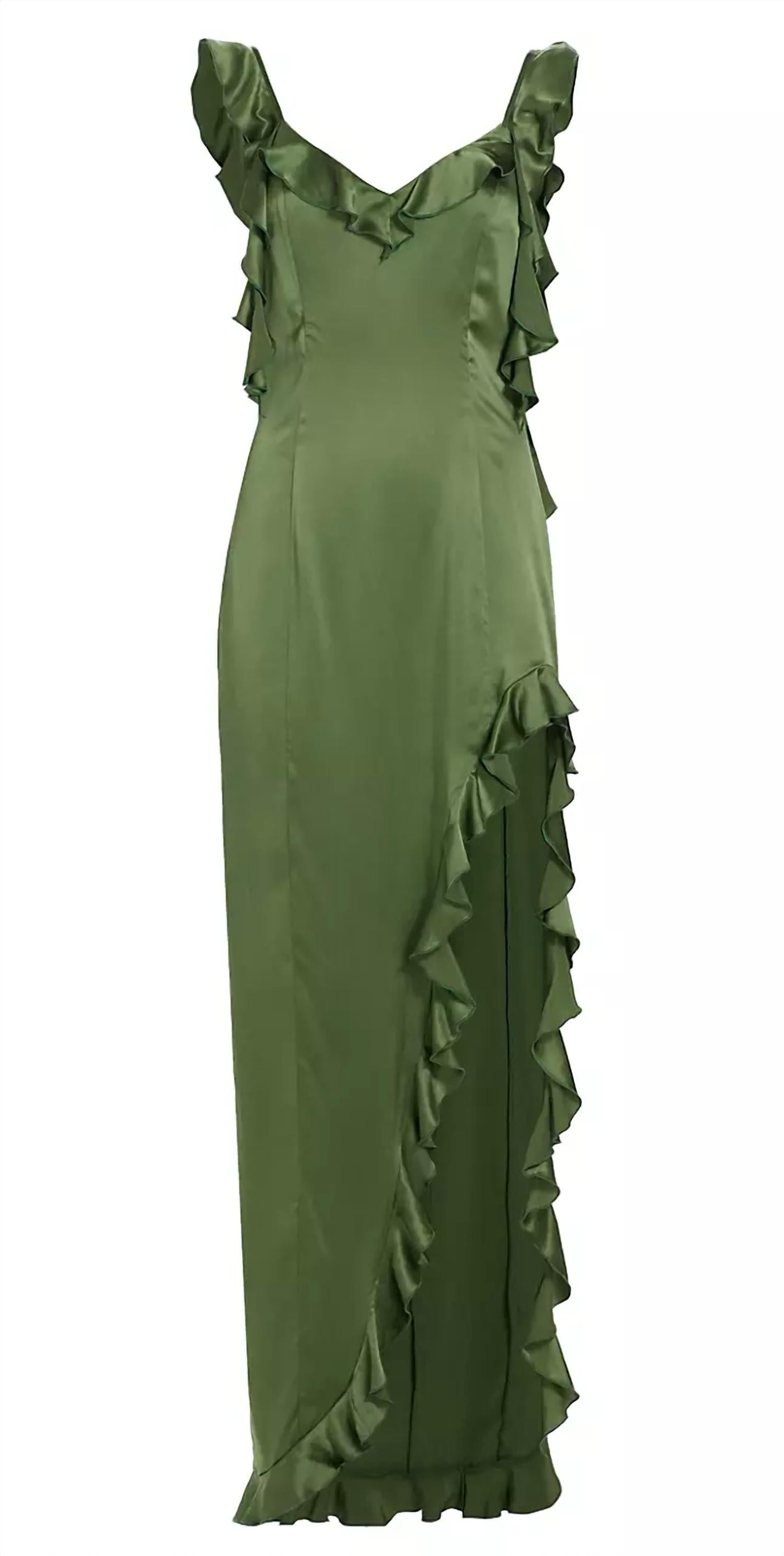 Introducing the Sonnet Ruffle Gown by Amanda Uprichard, an exquisite silk dress in Ferman, crafted for elegant evening events. This sleeveless, floor-length gown features a v-neckline with cascading ruffle trim that enhances its chic sheath silhouette. Composition: 100% Silk. Closure: Invisible zip closure at center back with hook and eye. Care: Dry clean only. Length from shoulder to hem is 60 inches, modeled in size small (5'7.5" height, 34.5" bust, 29" waist, 38" hips).