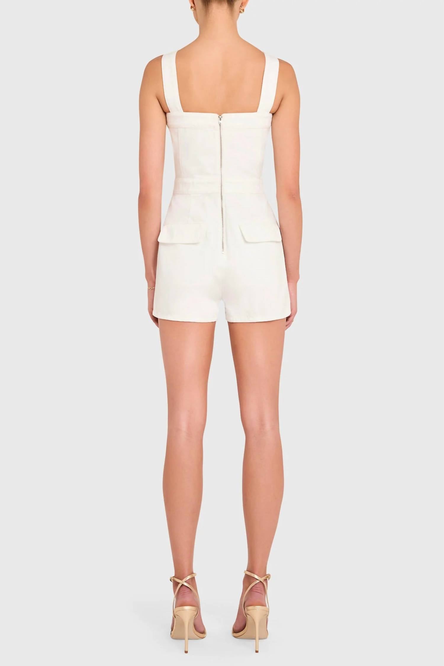 It doesn't take much for this one piece to look effortlessly cool. Add some statement jewelry to dress it up, or throw on some sneakers for a more casual vibe. The Frida Romper by Amanda Uprichard is a chic staple for any summer wardrobe, featuring a sleeveless design with a straight neckline that highlights its structured elegance. Crafted from 100% cotton with a lining of 65% polyester and 35% cotton, this romper offers a comfortable fit. Its solid white color, wide straps, and practical cargo pocket details add functionality to its stylish aesthetic. Closure is secured with a metal zipper and hook & eye at the back, and it is recommended to hand wash cold, avoid bleaching and tumble drying, and iron on low heat.