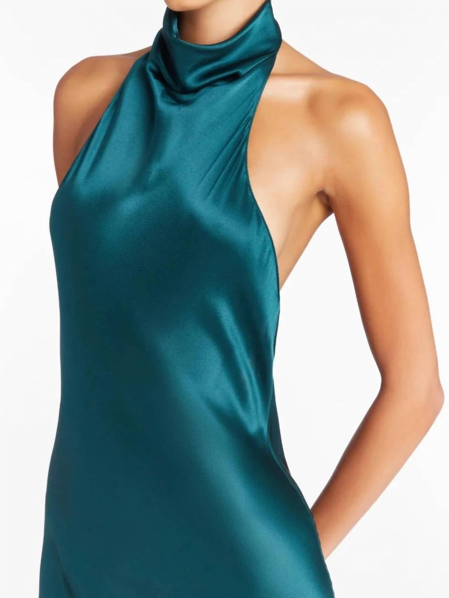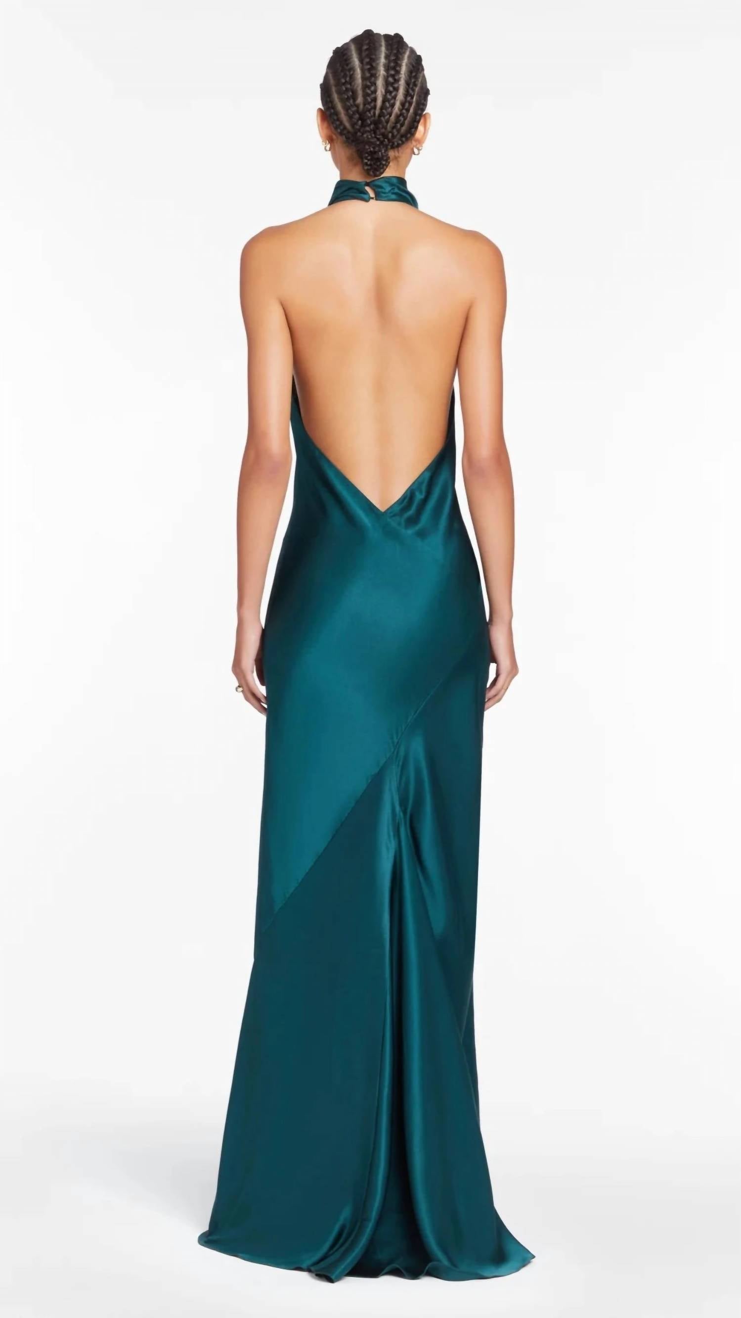 Embrace elegance with the Amanda Uprichard Rainier Cowl Halter Gown, a stunning sheath maxi dress in a chic conifer hue. This sleeveless, solid silk piece features a sophisticated cowl halter neckline with a convenient clasp at the neck and a bias cut tailored for graceful movement. The gown offers a luxurious 70" length from shoulder to hem, designed for evening events or a posh New Year's Eve celebration. Care for this exquisite piece with dry cleaning, and make a lasting impression with its quiet luxury aesthetic. Model is wearing a size small (5'7.5" height, 34.5" bust, 29" waist, 38" hips).