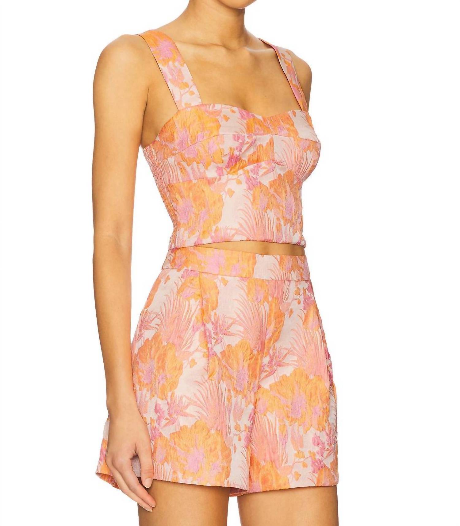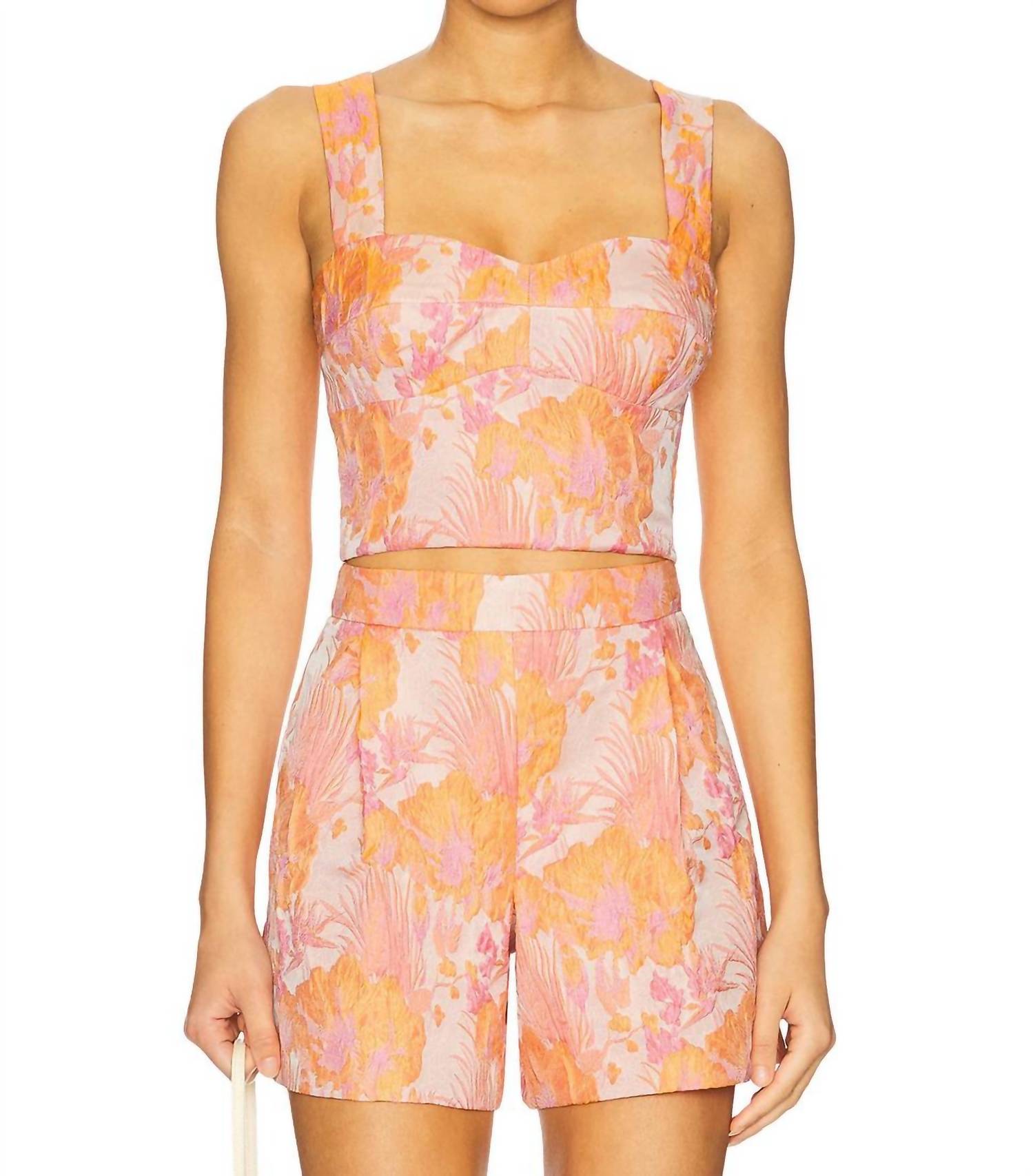 The perfect tank top for those warmer weather seasons. Step into summer with the vibrant Kenley Top by Amanda Uprichard, a sleeveless bandeau perfect for a playful yet chic look. Crafted from a blend of 95% Polyester and 5% Elastane, this cropped top showcases a stunning floral pattern with a flattering sweetheart neckline. Closure: Back zip closure. Care: Dry clean only. Ideal for a holiday party or any fun summer occasion.