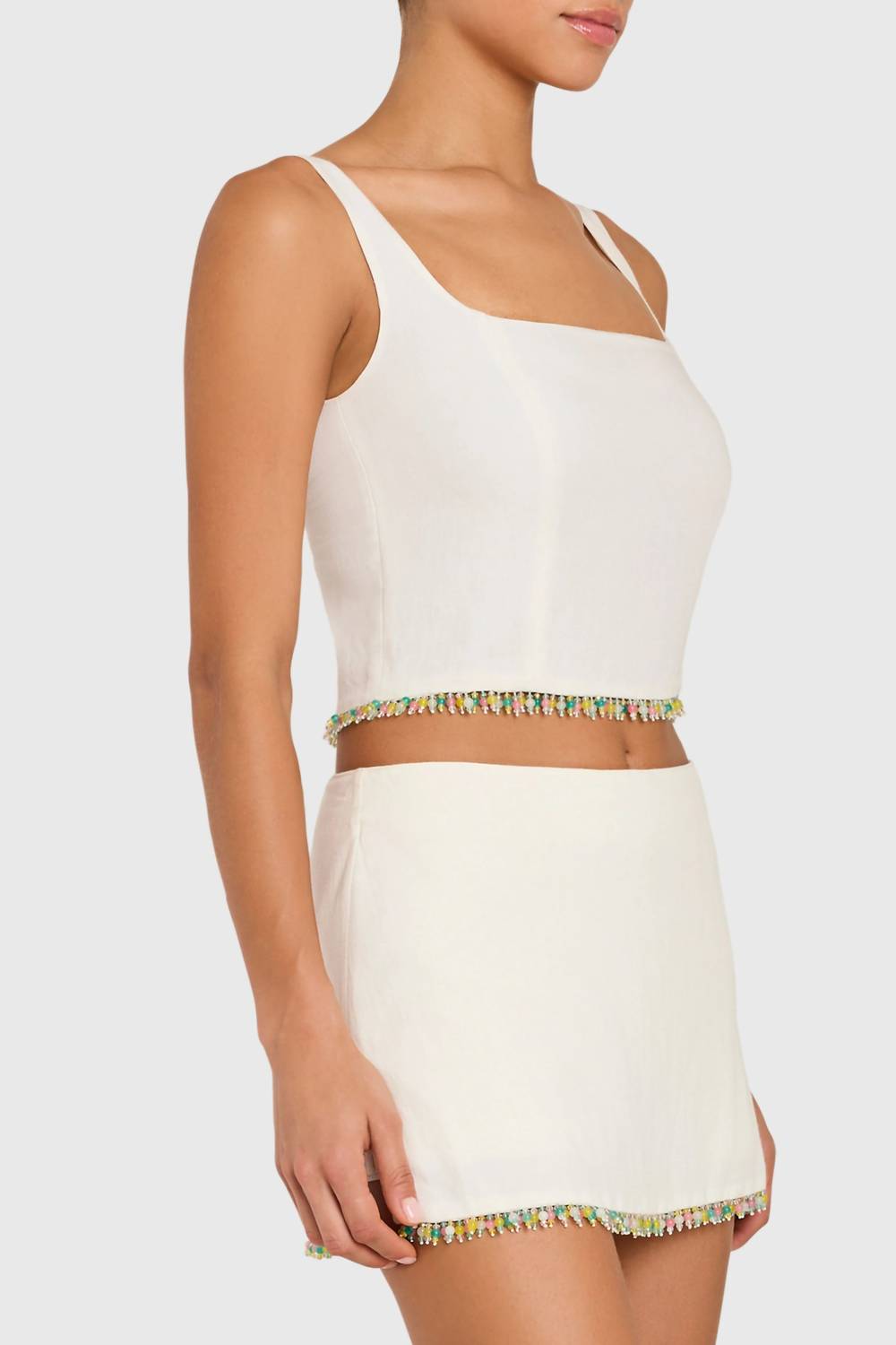 Perfect for layering or cute enough to wear it on its own. The Jace Square Neck Top by Amanda Uprichard in ivory is a chic addition to any wardrobe. This sleeveless camisole, featuring a slim fit with a square neckline and a beaded fringe hem, is crafted from a 70% viscose and 30% linen blend with a 100% cotton lining. It closes with a convenient back zip closure. Care instructions: hand wash cold, line dry in shade, warm iron, and do not dry clean.