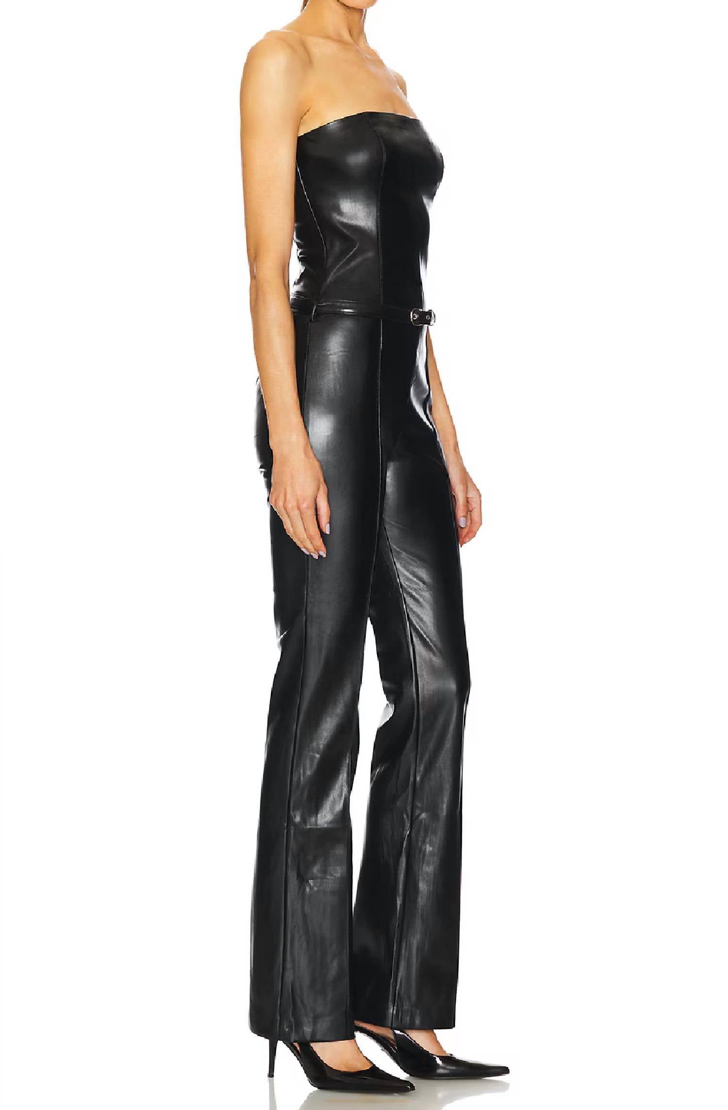 This wide-leg jumpsuit is crafted from luxurious faux leather with a high-rise waist and optional belt for added flair. Made from durable polyester, it features convenient back welt pockets and a hidden back zipper closure. Dry clean only.