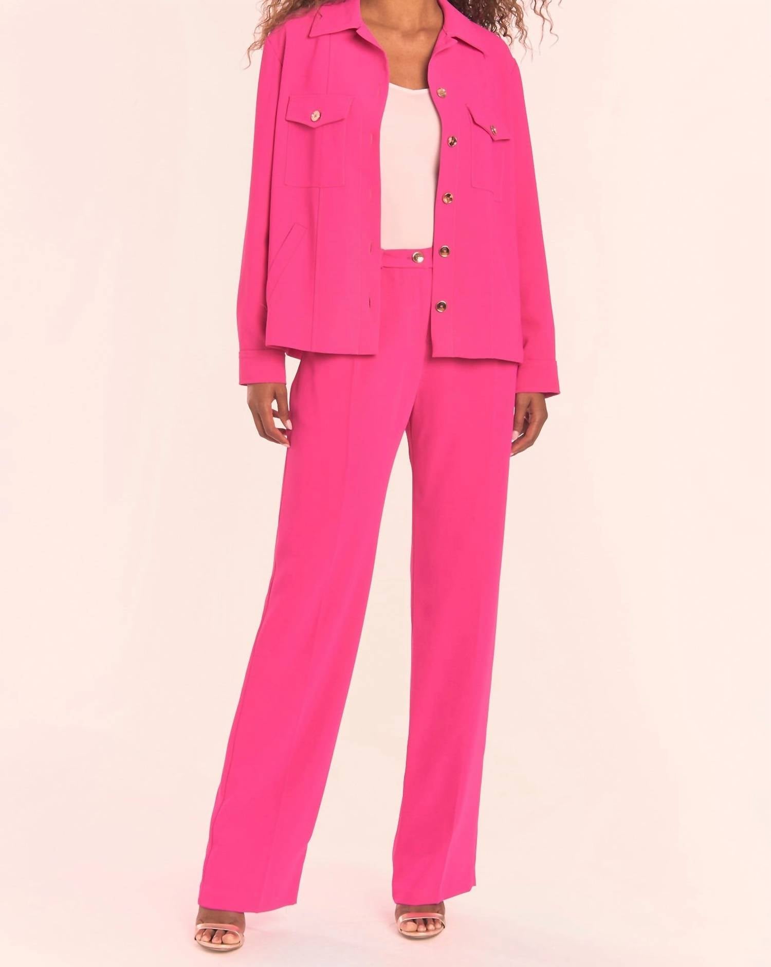 Elevate your style with the Veda Pants by Amanda Uprichard in a vibrant hot pink. These high-waisted trousers feature a subtle front center pleat for a sophisticated look. Perfect for any occasion, they bring a pop of color to your wardrobe with their solid pattern design.