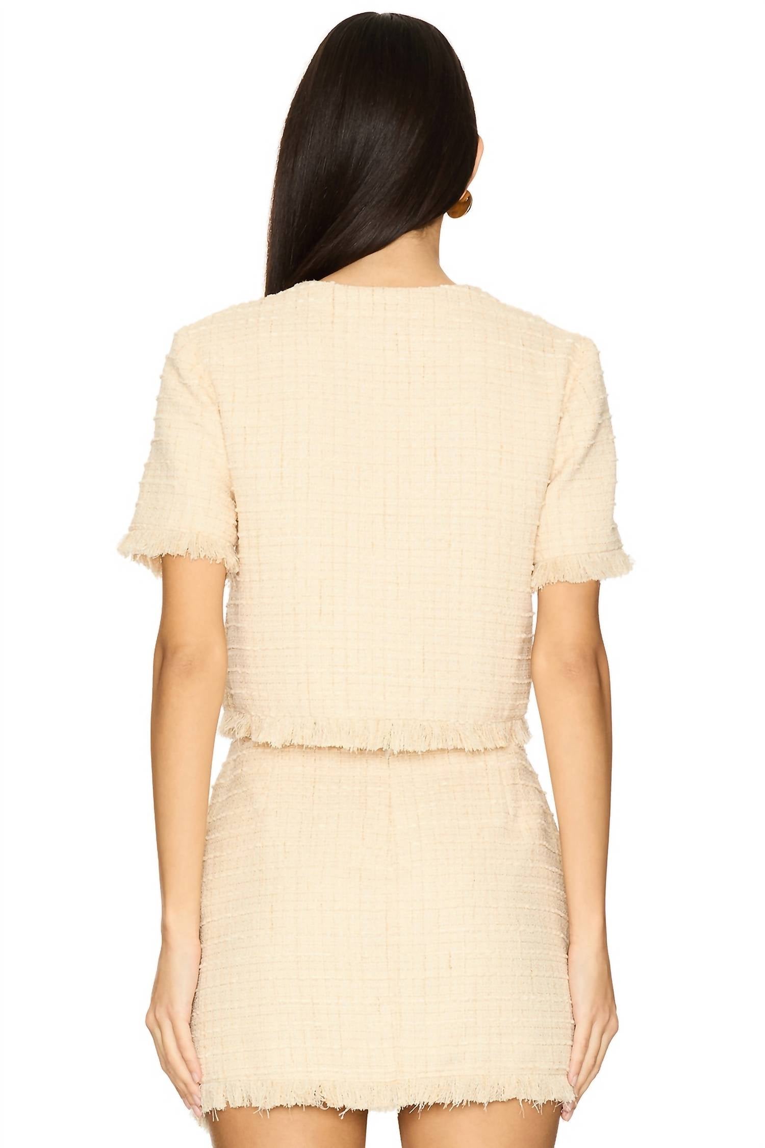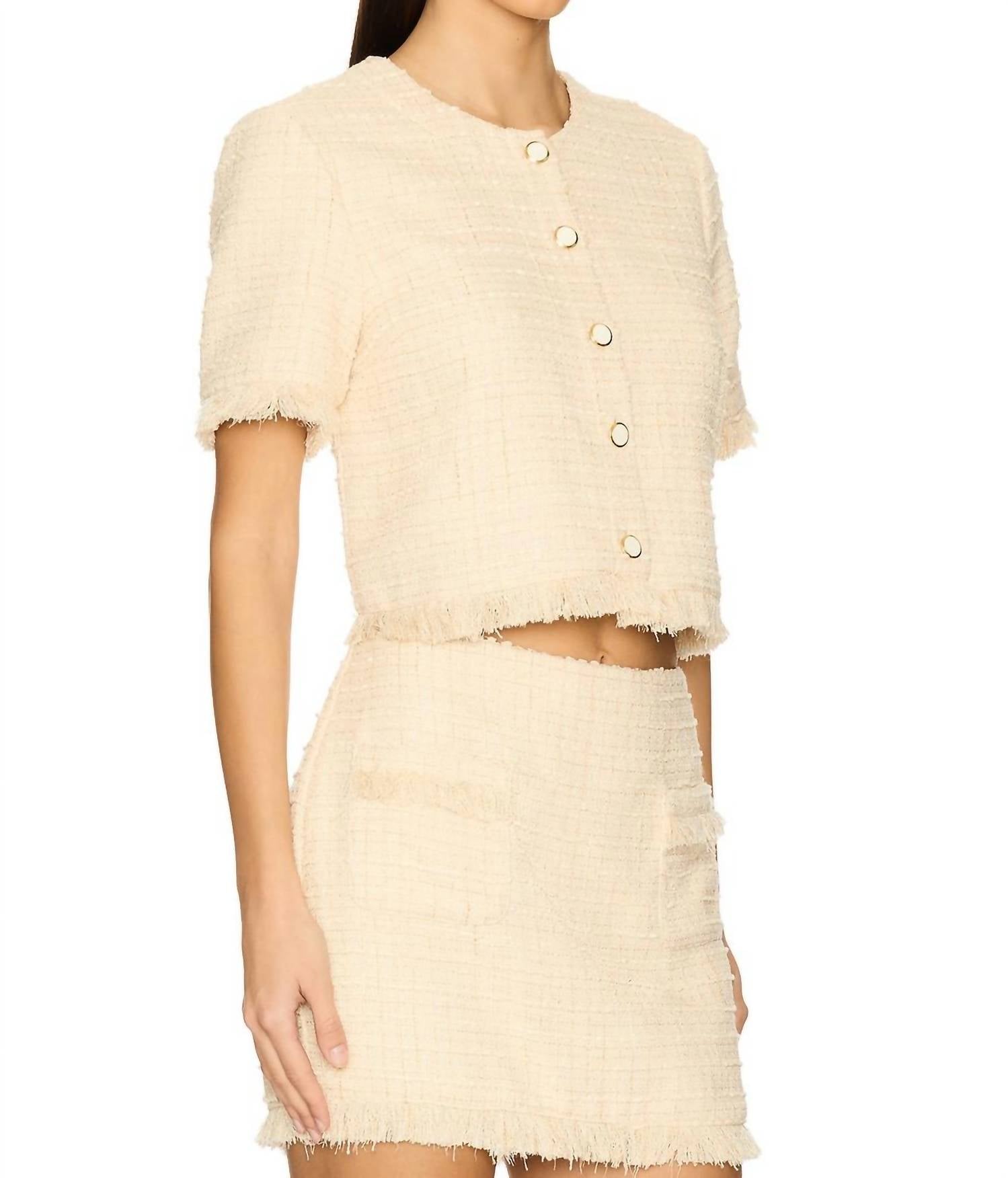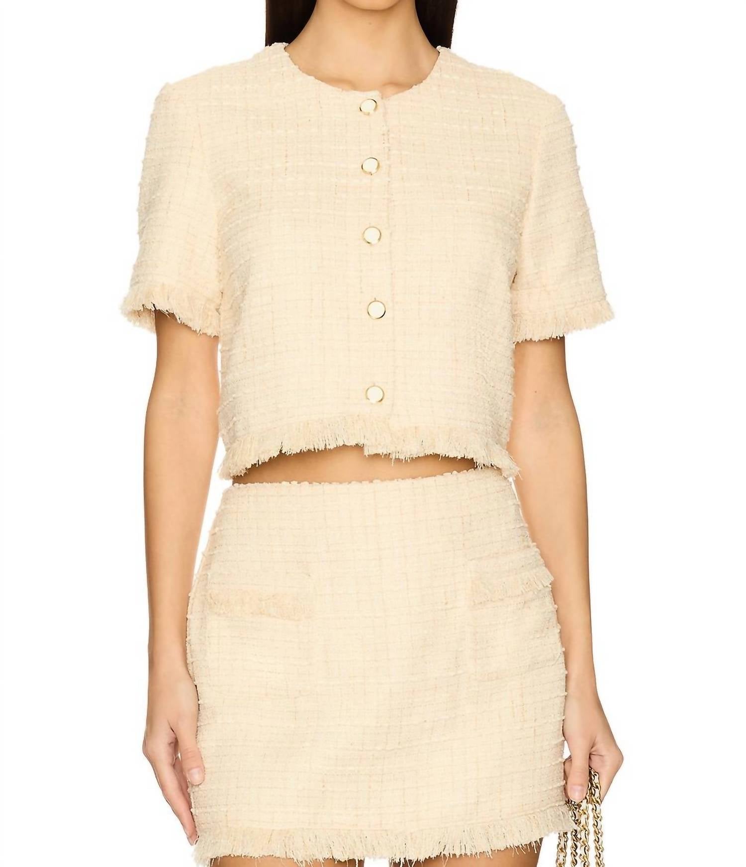 A timeless blouse that will never go out of style. Meet the Andrea Top by Amanda Uprichard, a stylish addition for any summer wardrobe. This women's blouse features short sleeves and is crafted from medium-weight tweed with 100% polyester main material and a polyester-elastane blend lining. Its elegant design includes gold-colored button closures at the front and a crewneck accented with textured fringes. Made in China, care instructions recommend dry cleaning to maintain its quiet luxury appeal.