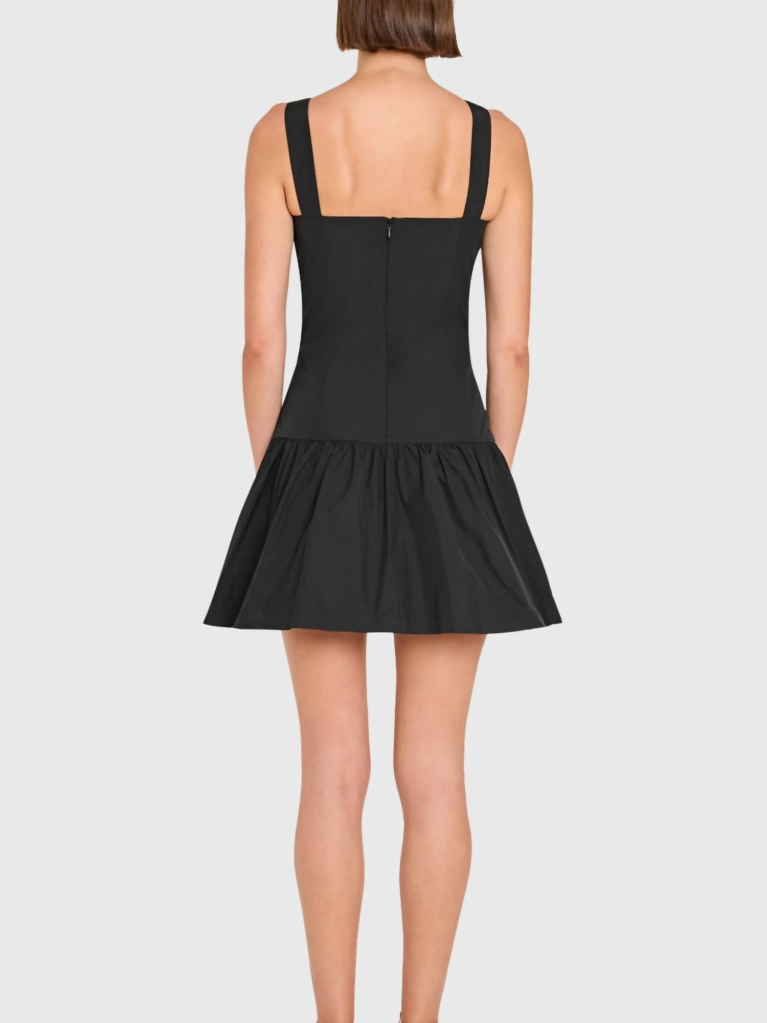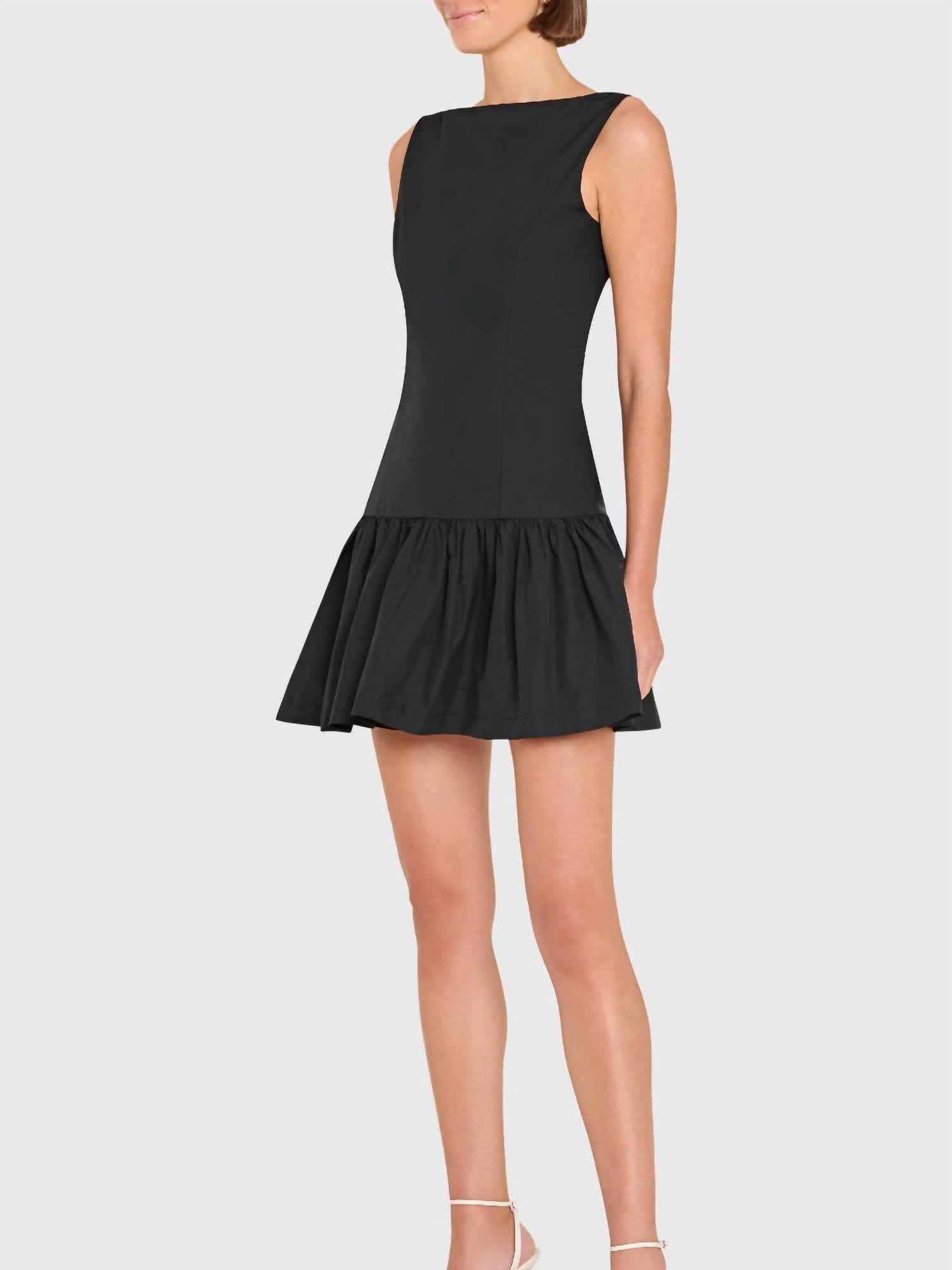 A short and breezy dress for those warmer days. Step into elegance with the Katina Mini Dress by Amanda Uprichard, a stunning choice for any dinner party. This sleeveless dress in classic black features a chic boatneck and a drop waist, perfect for those who love a minimalist, yet sophisticated style. Composed of 100% polyester and showcasing an A-line silhouette, it's designed for both comfort and fashion-forward appeal. Closure: Pull-on style. Care instructions indicate machine wash on a gentle cycle and line dry. The model is wearing a size XS with measurements of 5'10.5" height, 31.5" bust, 24.5" waist, and 35.5" hips. Imported.