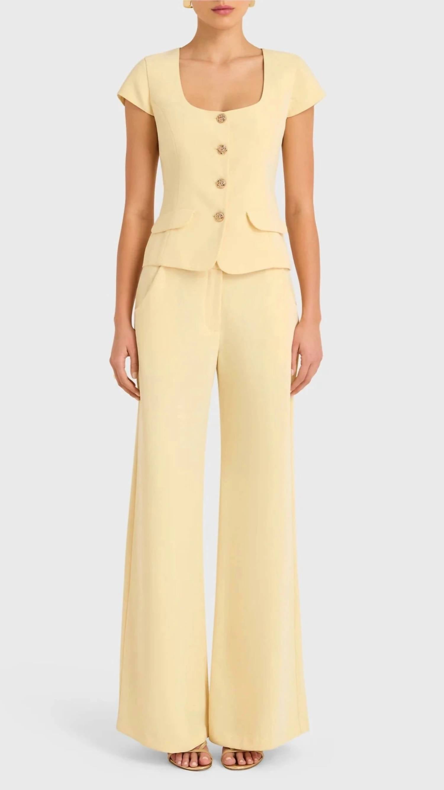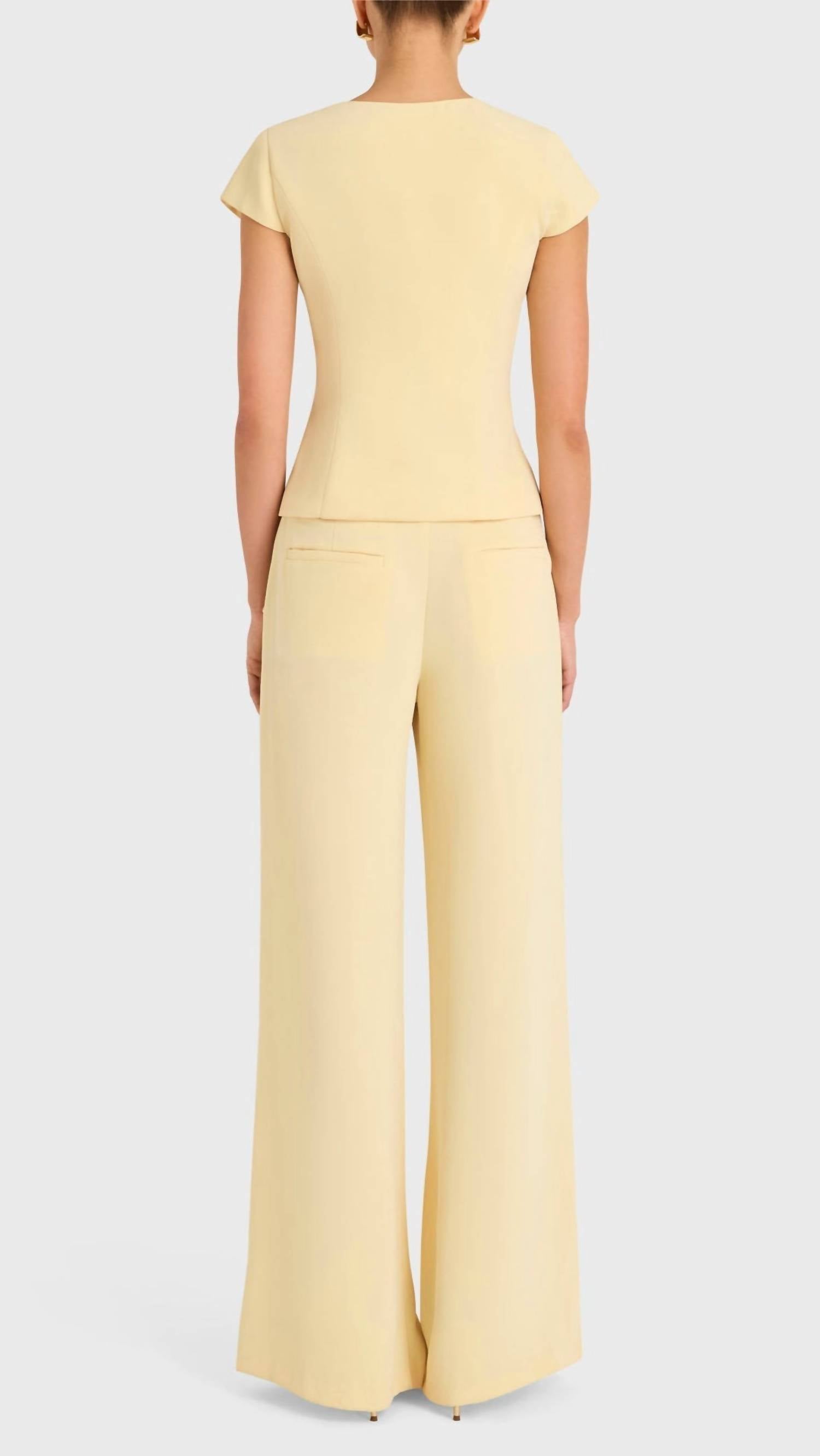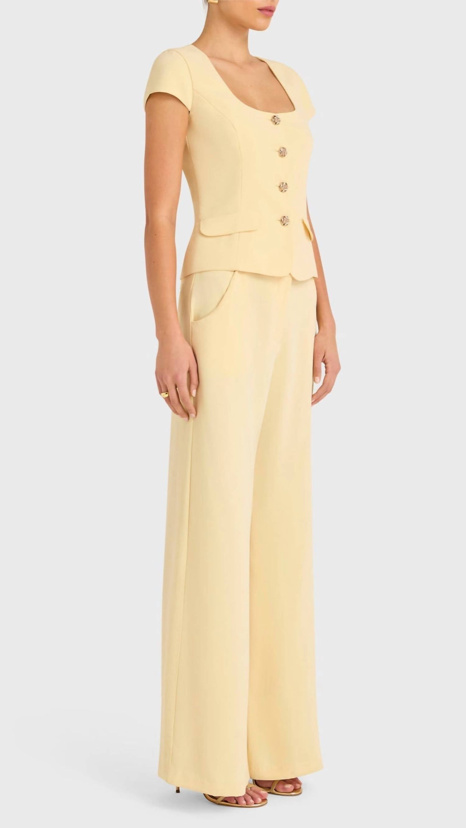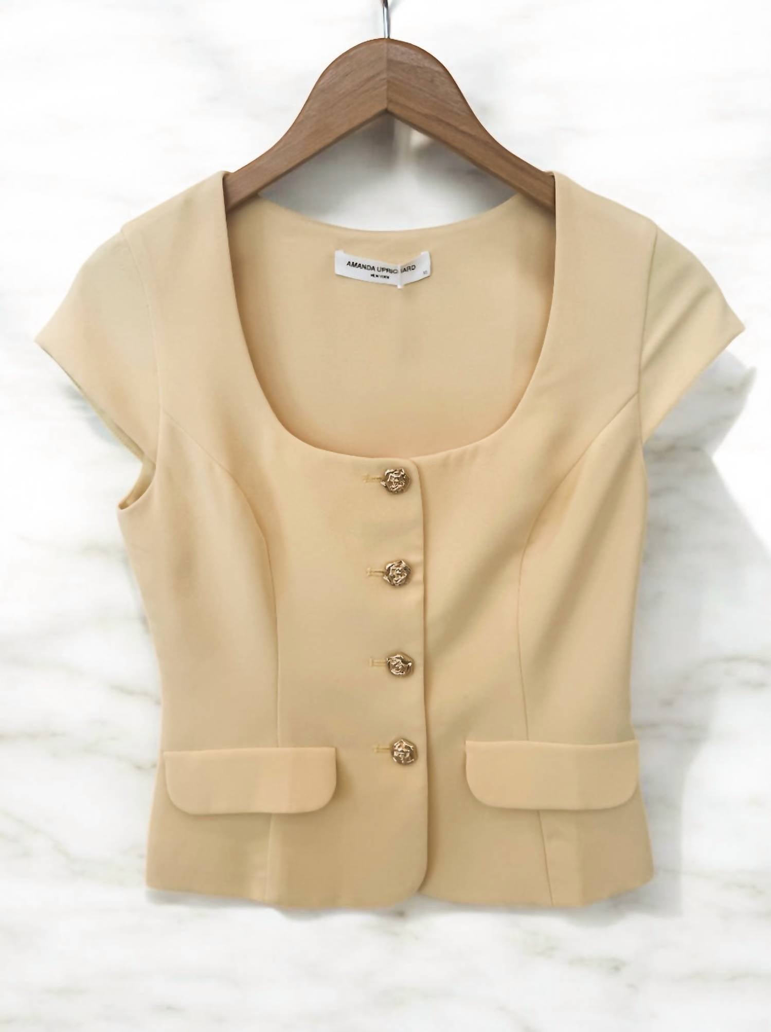 Pair this with your favorite jeans and slides for your next girls night out. Introducing the Kya Short Sleeve Top by Amanda Uprichard, an elegant piece in a solid cornsilk fabric for women who appreciate understated style. This blouse features a flattering scoopneck and chic cap sleeves, crafted from 100% polyester. It includes convenient pockets and is secured with a button closure. Care: Dry clean only.