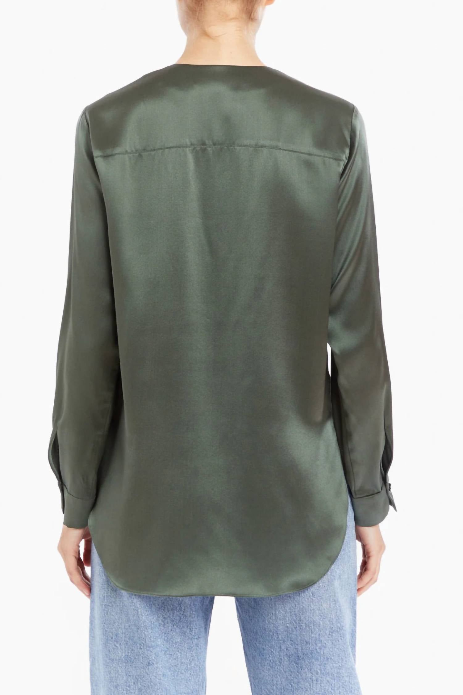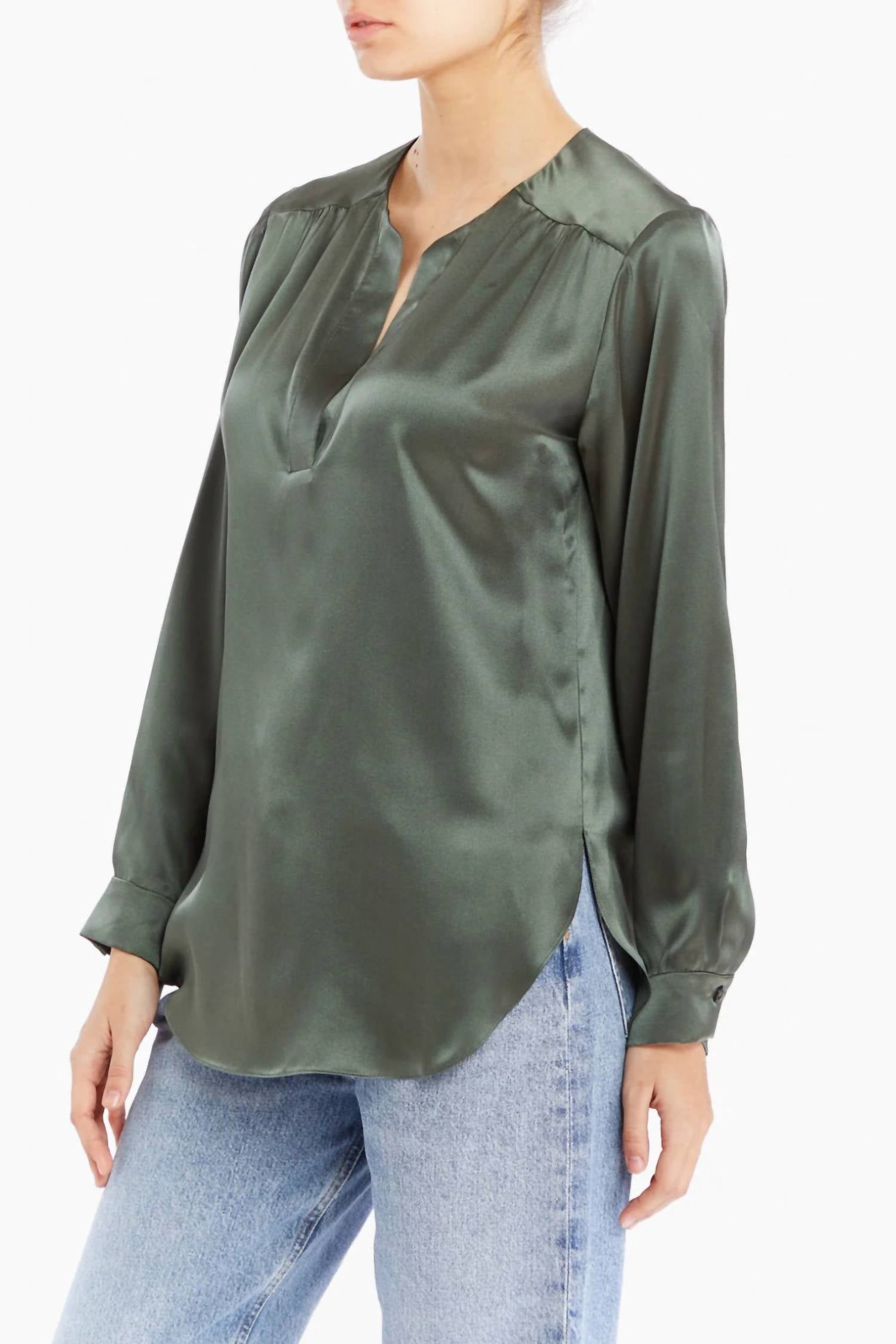 The Highliner shirt by Amanda Uprichard in tarragon is made from silk charmeuse. It is versatile for both casual outings with jeans and professional settings with black pants.