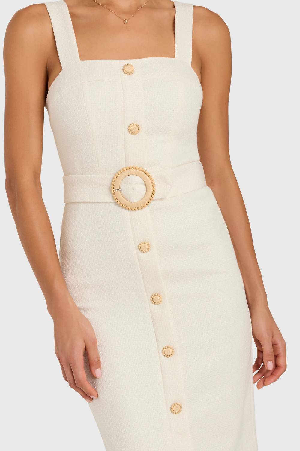 The perfect length dress does exist. Introducing the Uptown Midi Dress by Amanda Uprichard, a refined choice in elegant ecru for those who appreciate quiet luxury. This sleeveless sheath dress is crafted from 100% polyester, offering a sophisticated silhouette with its decorative raffia buckle and buttons. It features a button closure and a skirt vent at the center back for added movement, while the complete lining ensures comfort throughout. Perfect for summer dinners or garden parties, this piece demands dry cleaning to maintain its pristine condition.