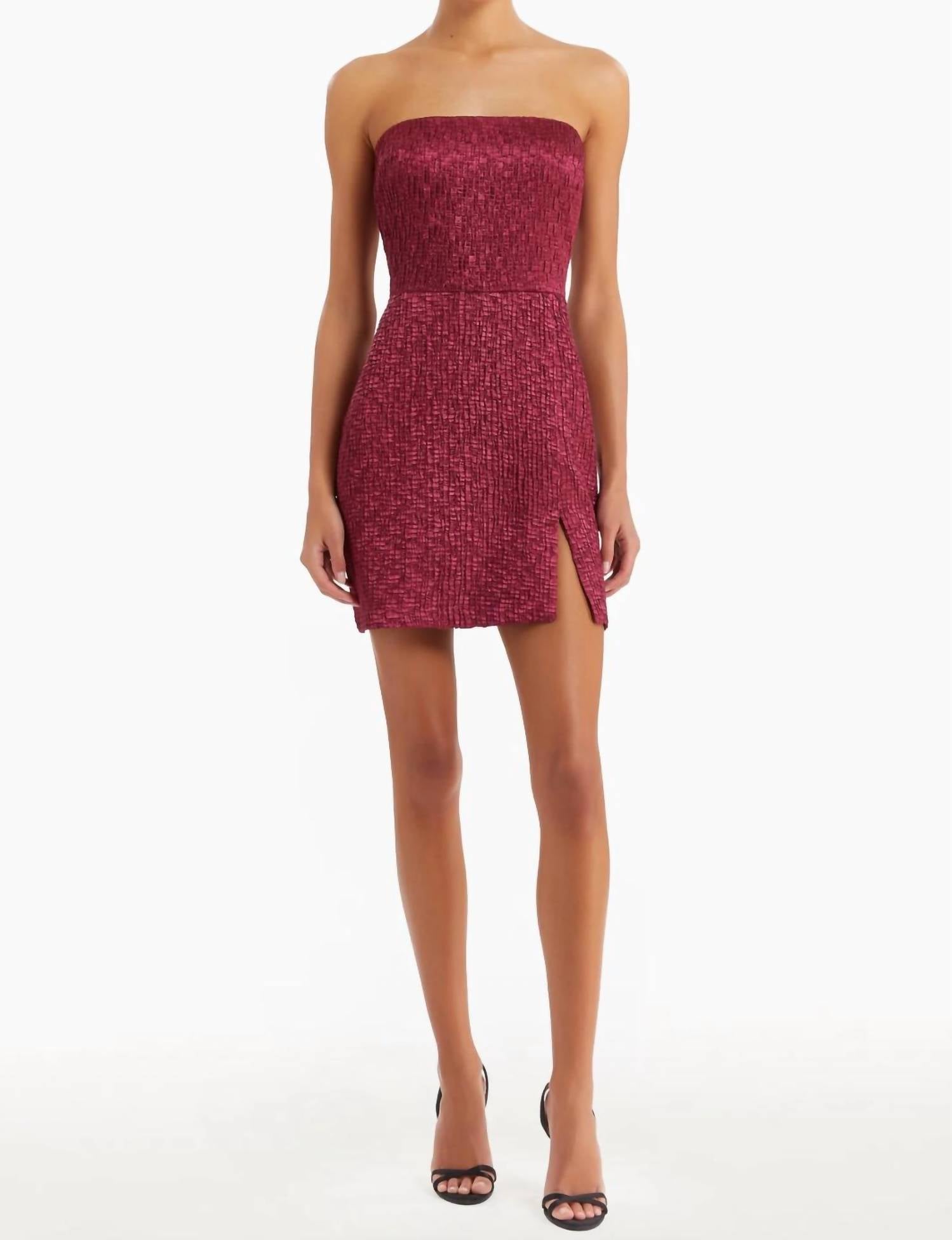 The pefect strapless dress for those warmer months. Add a cardigan for those cooler summer nights. Introducing the Arely Mini Dress by Amanda Uprichard, a stunning strapless piece designed to highlight your curves with a bodycon silhouette. Crafted from 100% Polyester, this burgundy dress features a micro slit at the front and is fully lined for added comfort. Made in the US, it is a chic choice for cocktail parties and special occasions. The pull-on style offers ease, while hand washing and line drying are recommended for care. Model is wearing a size Extra Small (5'10.5" height, 32" bust, 34" hips).