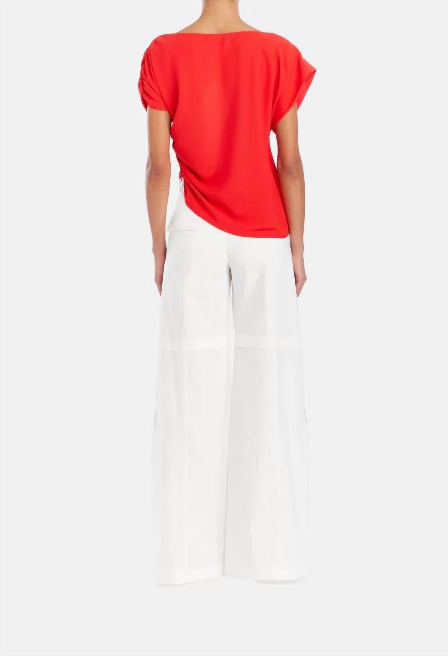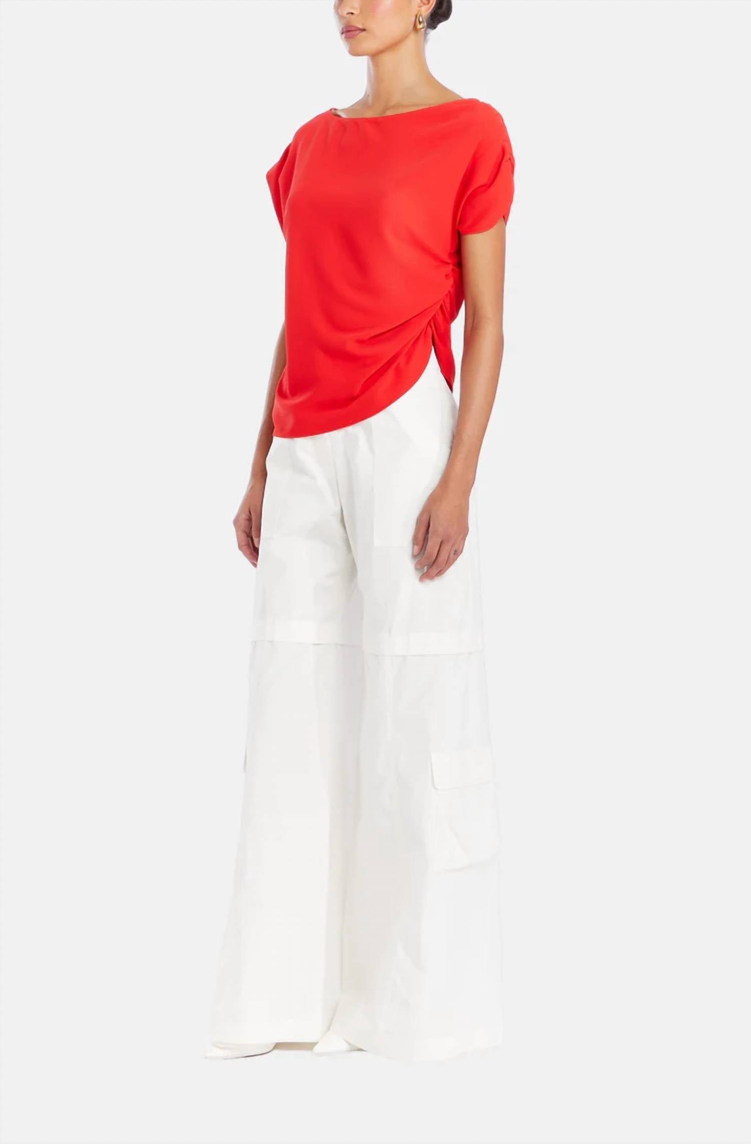 Epitome of effortless style and versatility. In a striking Candy Apple hue. Short sleeve blouse boasts a unique boat neckline that elevates its classic silhouette. Offers comfort and durability. Easy pull on closure. Crafted with high-quality fabric.