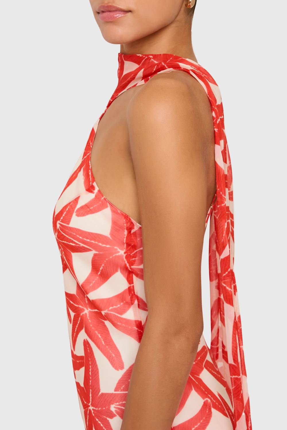Style this maxi with your favorite statement necklace and sandals for the perfect look. Step into summer elegance with the Ashton Maxi Dress by Amanda Uprichard, a sheath silhouette in a starfish color designed for grand entrances. This sleeveless, patterned dress features a unique halter neckline with a scarf detail that gracefully drapes down your back. Made from 100% Viscose with a 100% Polyester lining, this dress is perfect for an anniversary celebration and is sure to leave an impression. Closure is a pull-on style, and it requires dry cleaning to maintain its maximalist appeal.