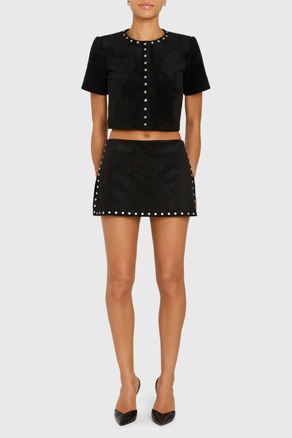 The perfect crop top for those warmer weather days. Introducing the Amanda Uprichard Braswell Suede Top, a sophisticated addition to your wardrobe with a black monochrome aesthetic and retro-inspired gold button details. Featuring short sleeves and a solid pattern, this women's cropped top is crafted from a self-blend of 95% polyester and 5% viscose, with a 100% polyester lining. It boasts a crewneck design and convenient snap closure for easy wearing. For best care, this top requires dry cleaning only.