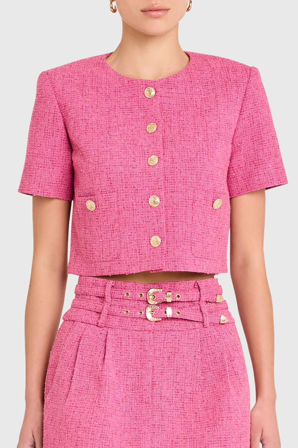Look no further, you just found your perfect tee! Make your move in the Braswell Top. Tailored in pink tweed with gold buttons and a cropped cut, this piece combines vintage charm with a bold, feminine feel. Pair with the Blythe Pants to make a statement. Perfect for: Shopping trips, brunch dates, dinner with the girls.