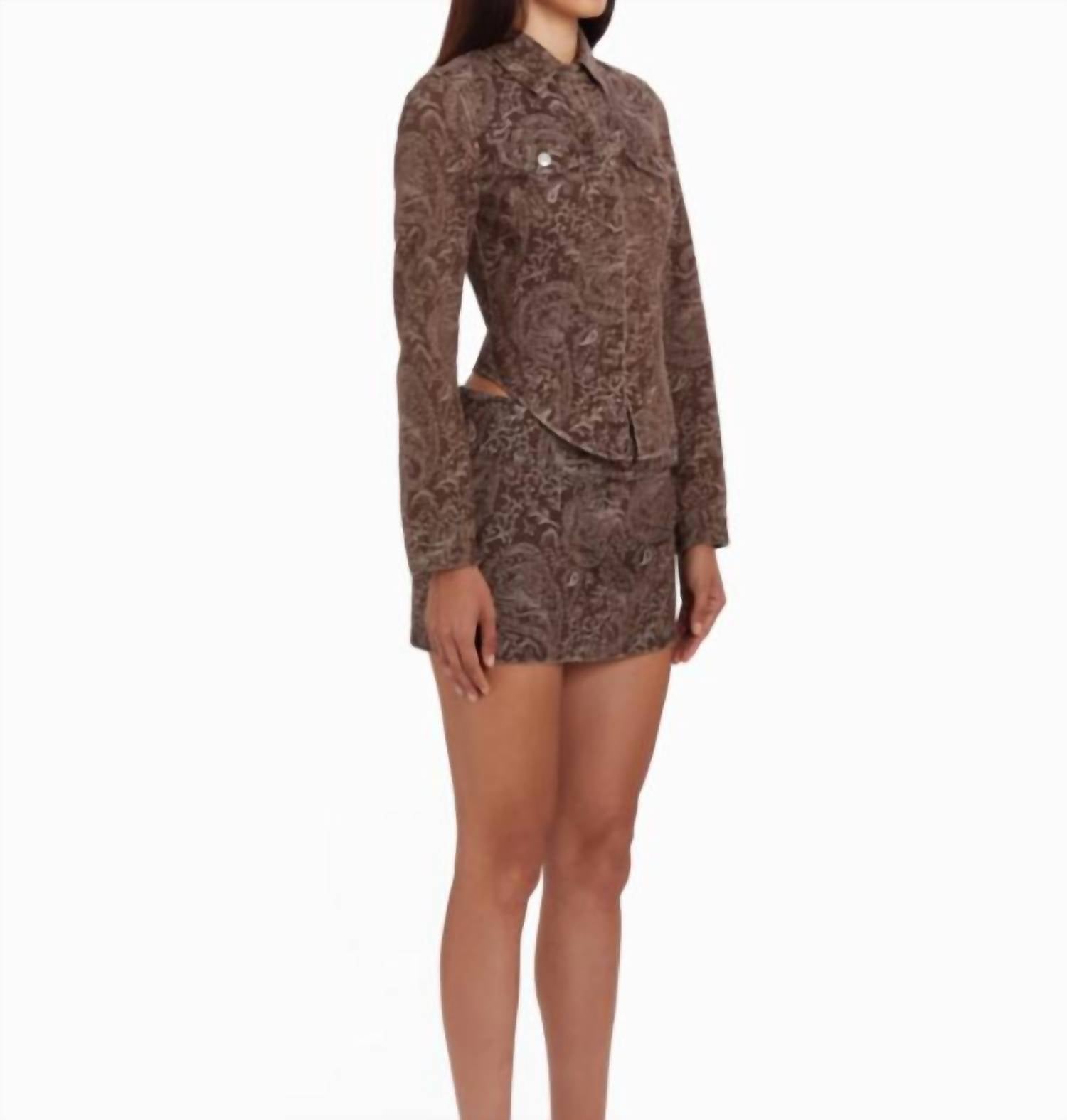 A long sleeve top you can wear with denim, skirts, well... just about anything! Elevate your spring wardrobe with the Bristol Top by Amanda Uprichard, a standout piece in a rich brown paisley pattern. Crafted from a cozy cotton blend, this long sleeve tee makes for a perfect pairing with your favorite bottoms. Featuring a collared neckline, button closure, and convenient pockets, it effortlessly blends boho chic style with functionality. Ideal for Thanksgiving or a holiday party, this versatile top is a must-have for the season.