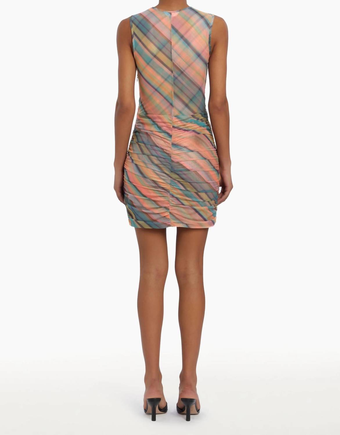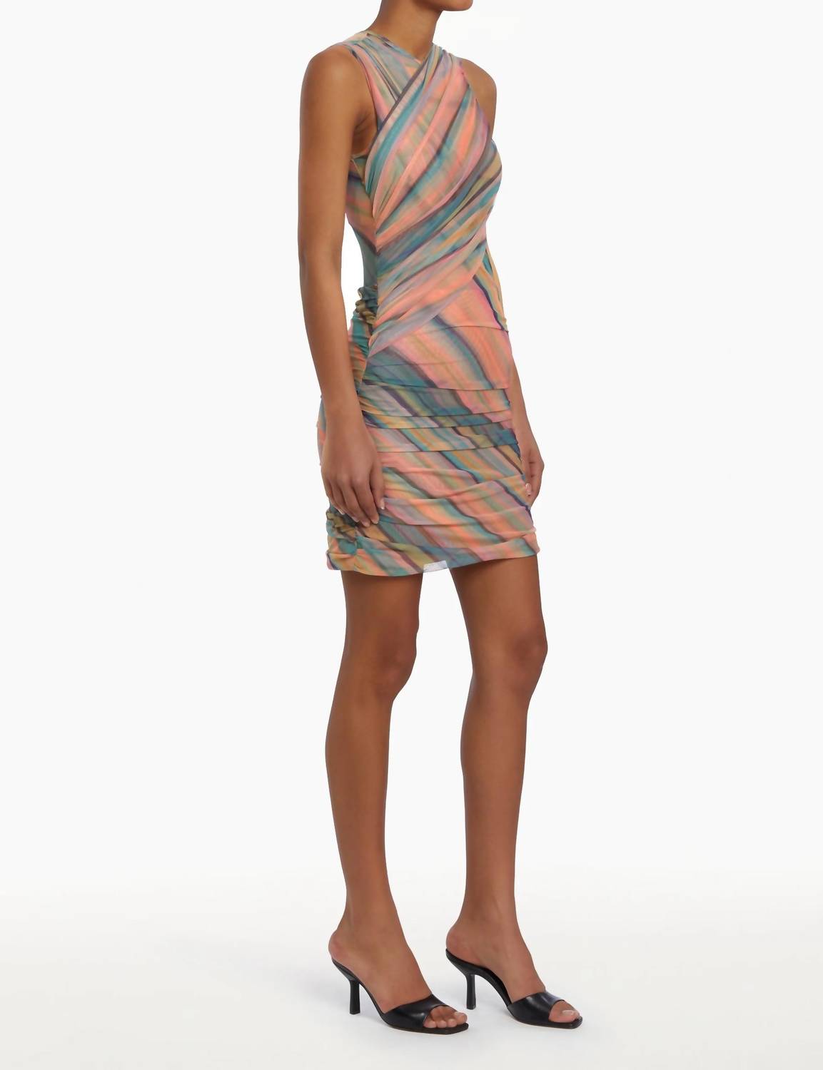 The kind of easy and flattering dress you'll be reaching for all season long. Experience elegance with the Amanda Uprichard Romina Mini Dress, intricately designed for bold sophistication. This sleeveless mini dress boasts a striking Carousel Striped pattern and is crafted from 92% polyester and 8% elastane with a lining of 90% polyester and 10% elastane. Its form-fitting silhouette is accentuated by a ruched wrap design and a high V-neck, offering an imported statement piece for cocktail parties. Closure: Pulls over. Care: Hand wash recommended. Length is approximately 33.5" from shoulder to hem, ideal for a summer night out. Model is 5'10".