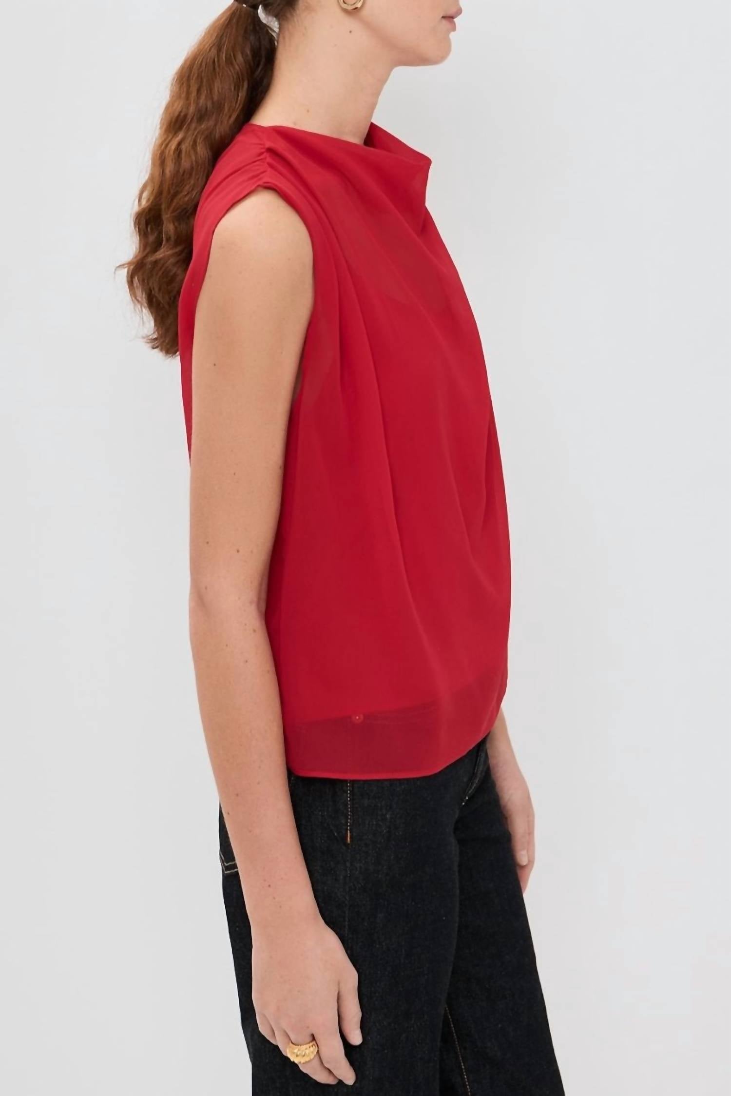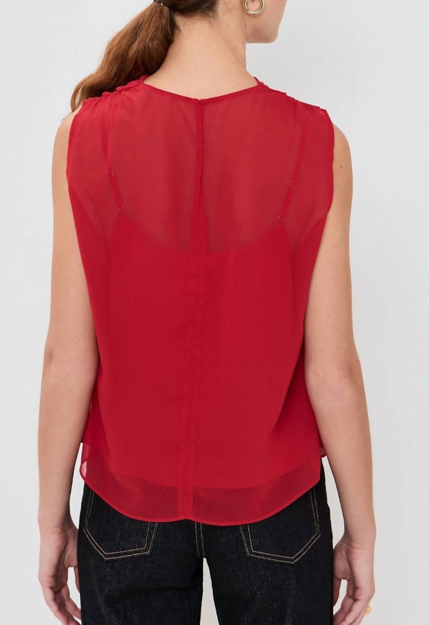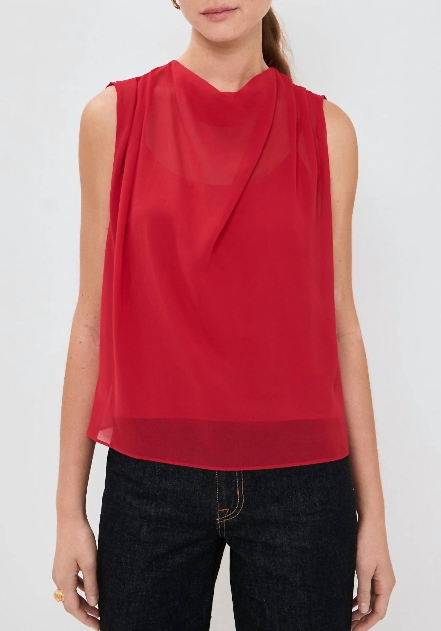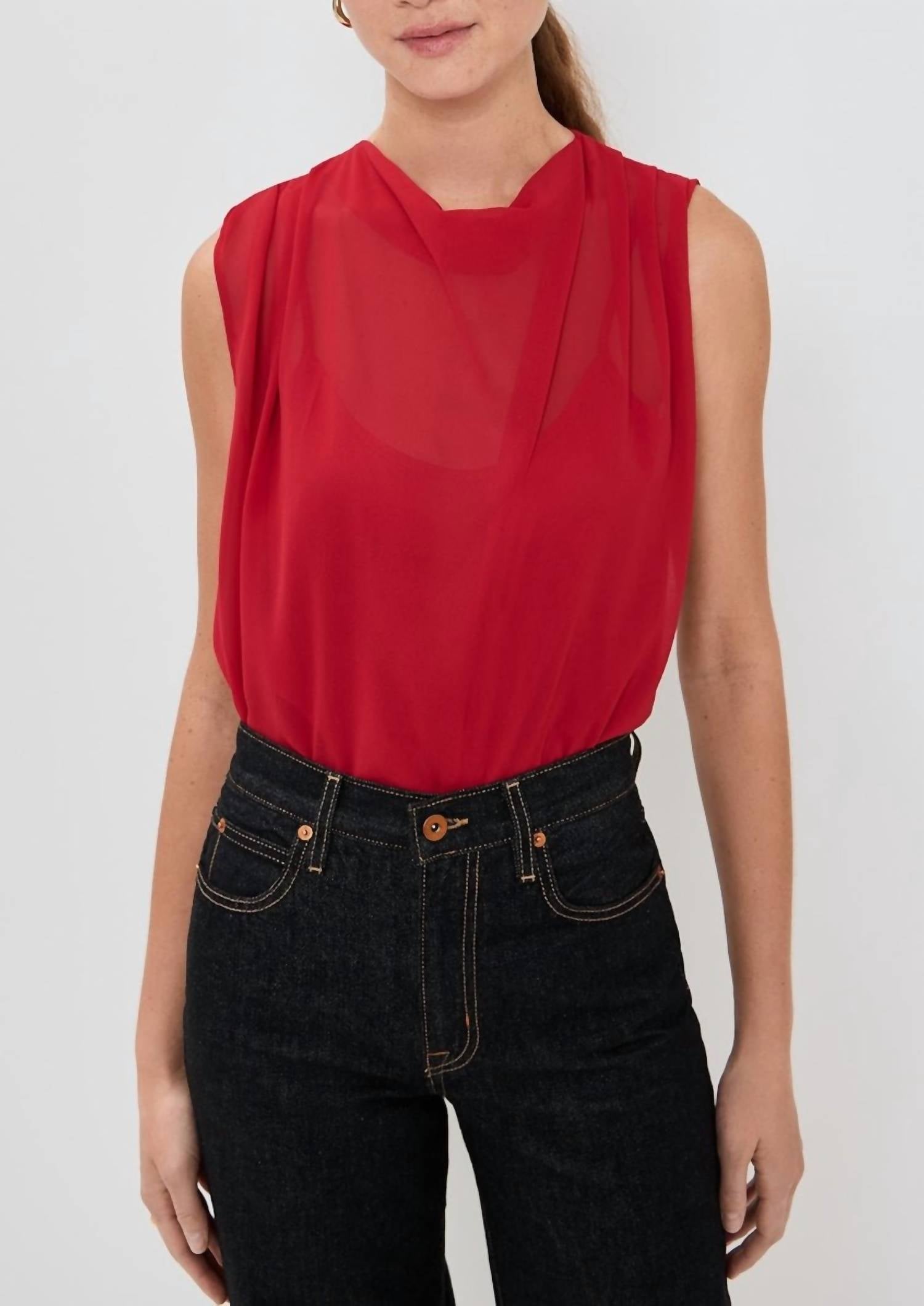 Pair this with your favorite jeans and slides for your next girls night out. The Red Scala Top by Amanda Uprichard is a chic addition to any wardrobe, perfect for a summer holiday party. This sleeveless blouse features a crew neck with a hook-and-eye closure at the back and is crafted from lightweight stretch chiffon. Its shell and optional tank lining are both composed of 100% polyester, offering a draped design that's lined for comfort. To maintain its elegant look, hand wash with care and line dry.