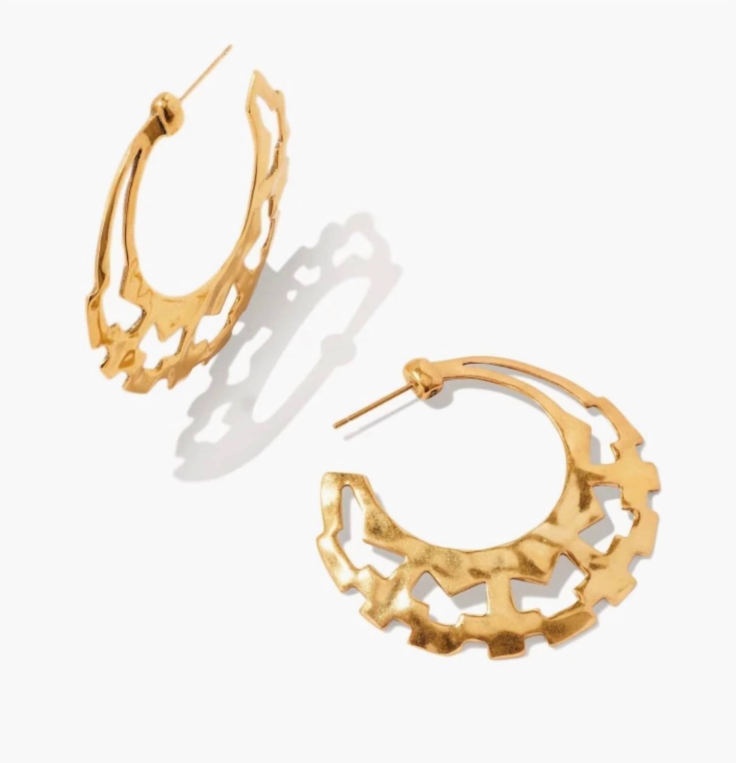 Classic earrings that will take you from season to season. Introducing the Women's Shiva Hoop Earrings by Kendra Scott, a striking interpretation of a timeless design. In a vintage gold hue, these earrings are crafted with intricate cutouts and details that celebrate historical symbolism and motifs. Material: Gold plating. Ideal for fashion-forward individuals seeking a unique accessory.