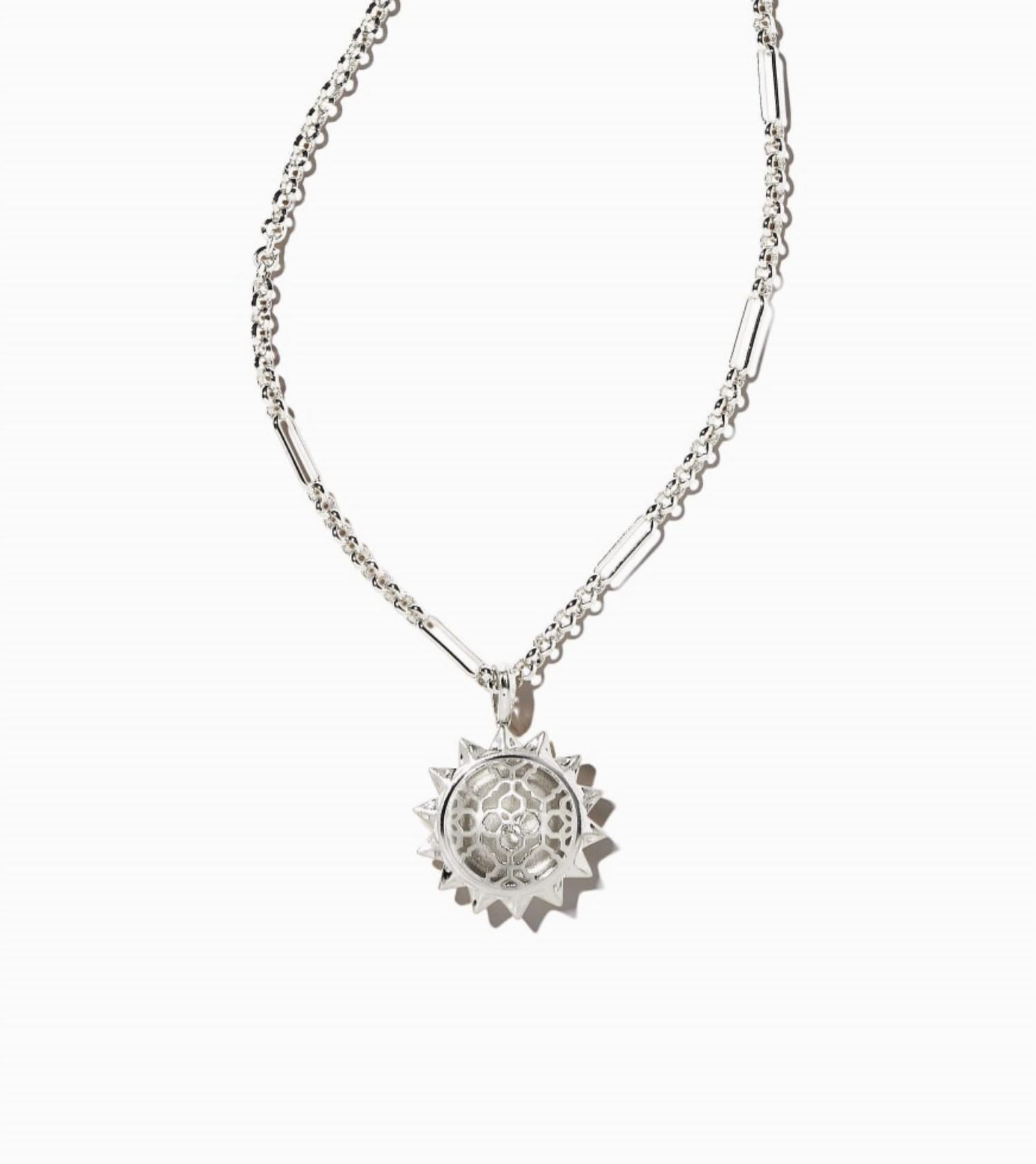Both understated and impactful, you'll be reaching for this one-of-a-kind necklace season after season. Introducing the Women's Sienna Sun Pendant Necklace by Kendra Scott, a dazzling piece in radiant silver perfect for adding a touch of sunshine to your look. This fashion necklace features a subtle linked chain with a versatile sun pendant that offers two stylish sides; show off a warm glow or flip to reveal the signature filigree texture. Material: Silver Plating. Closure: Equipped with a lobster clasp.