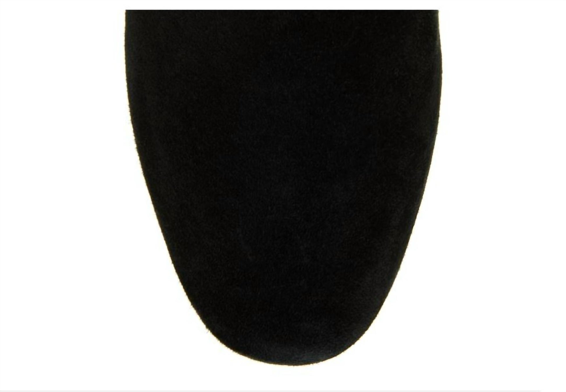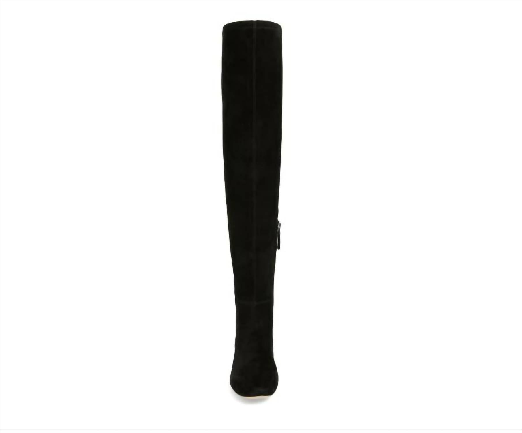 These over the knee boots are equal parts classic and cool. Play up a lean, leggy look with this suede boot in a clean and sleek style set on a low architectural heel with metallic logo accent. Round toe Inset side-zip closure Leather upper, lining and sole 1" (25mm) heel with silver tone accents, logo and mirror effect 22" shaft; 15" opening