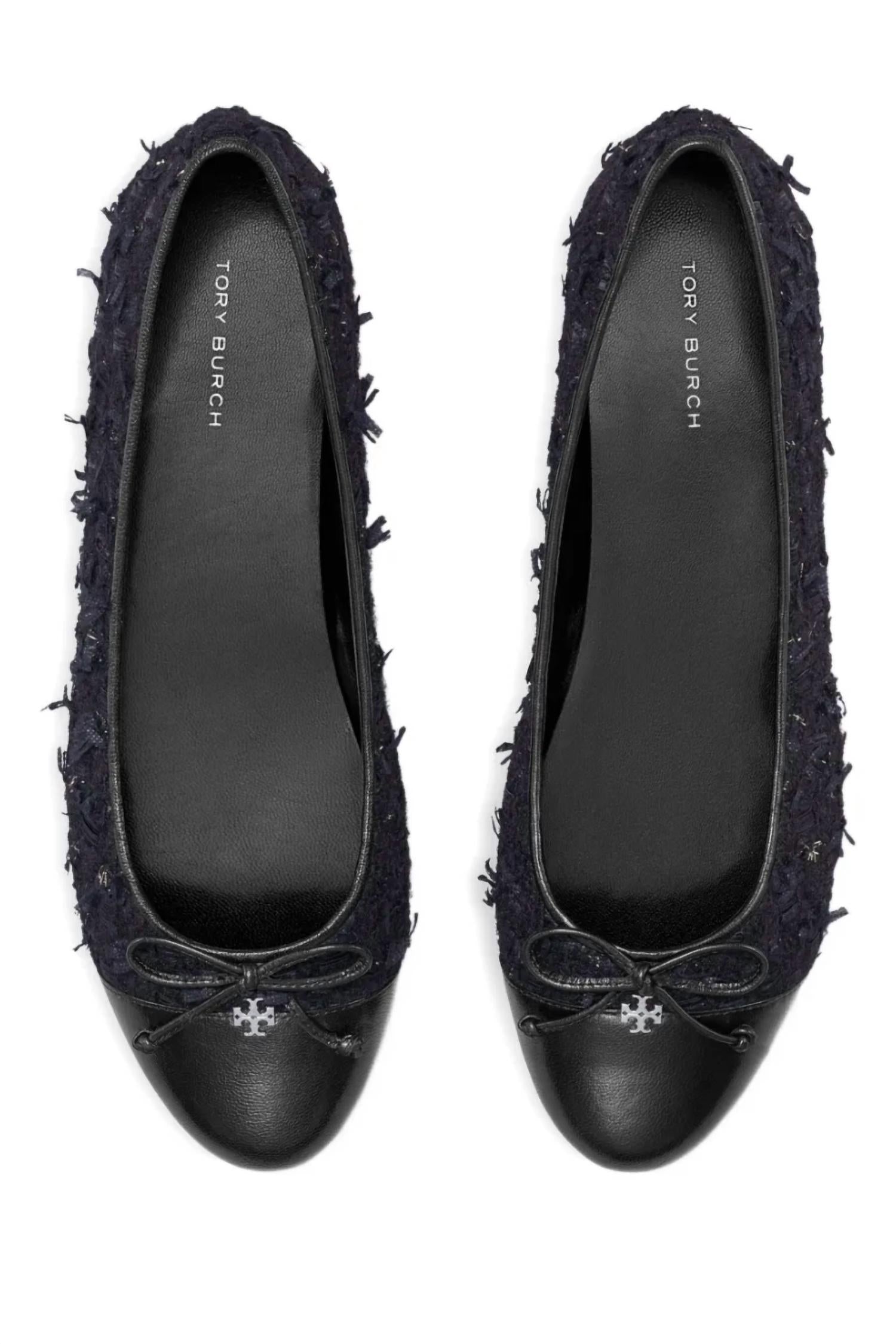 This sandal will take you from brunch to dinner and everything in between. Elevate your attire with the Women's Cap-toe Ballet Flats by Tory Burch, featuring a rich Midnight Navy Bouclé texture accented by a smooth black leather cap toe. These elegant flats offer a pointed toe shape and a flat heel, making them ideal for both workwear and dinner parties. Designed with a delicate bow and the subtle Double T logo, these flats transition effortlessly from day to night. Enjoy comfort with their soft lining and lightly cushioned sole, perfect for the Spring season.
