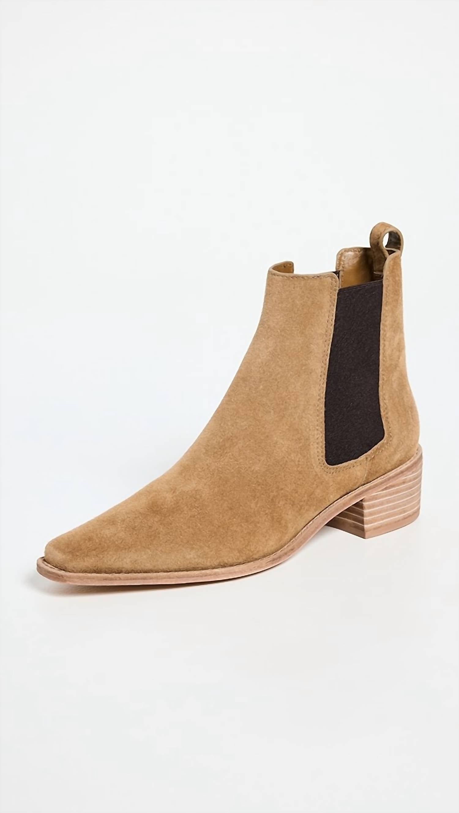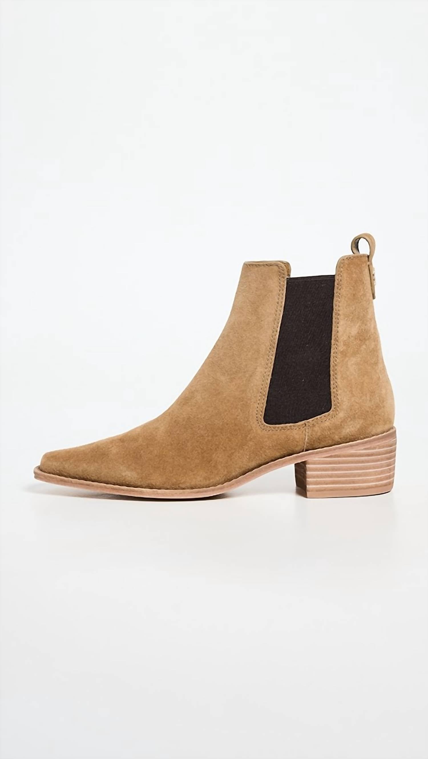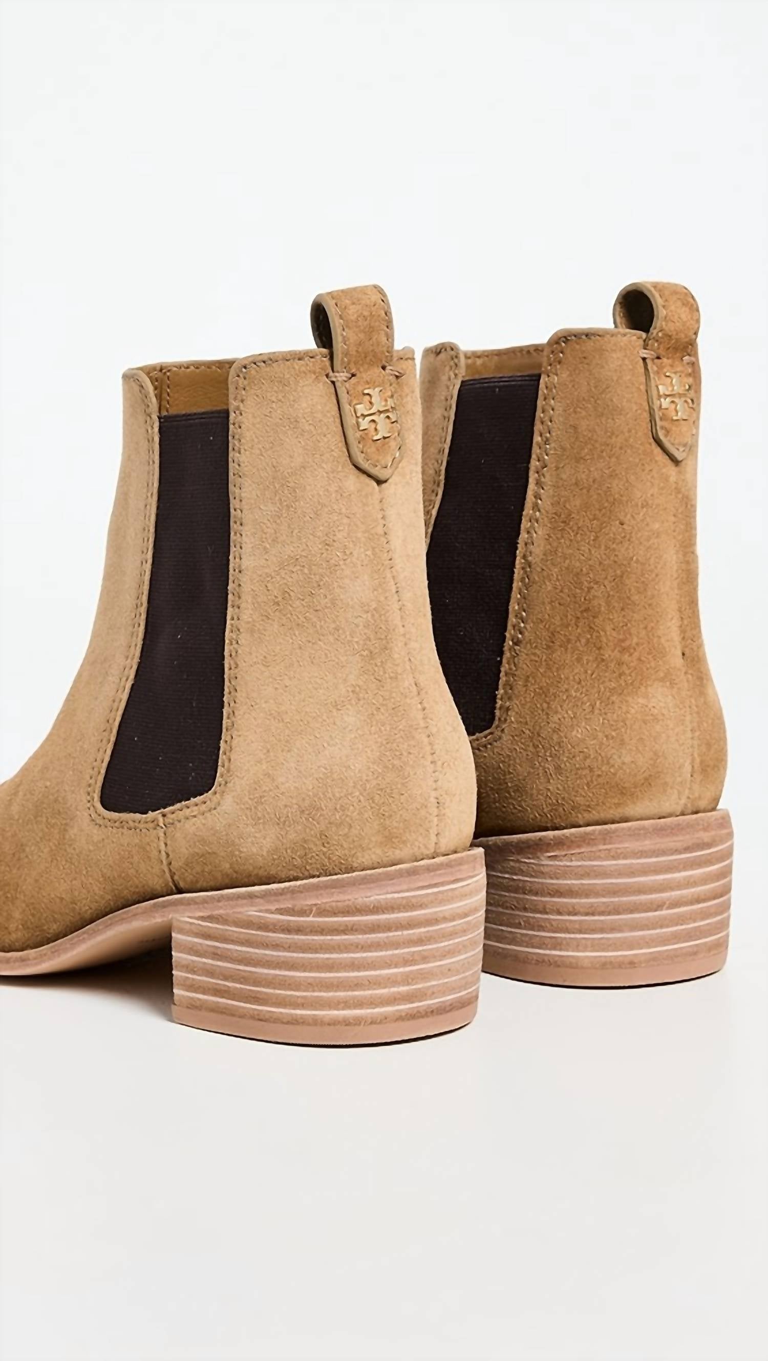 Say hello to the perfect, most versatile boot. The ankle height makes this style easily transition from day to night. Wear them with your favorite skinny jeans and tee for a more laid back look, or pair them with your favorite mini dress and jacket for a night out on the town. Step into timeless style with the Women's Casual Chelsea Boot by Tory Burch in the elegant shade of Alce. Crafted from premium cowhide with a suede finish, these boots feature a sleek pull-on design enhanced by gold-tone logo emblems at the back. The leather sole, complemented by a rubber heel cap, ensures durability, while the square toe and low 1.75-inch block heel provide comfort and modern flair. Heel Height: 1.75 inches (45 mm), Shaft Height: 5.5 inches (14 cm). Perfect for a holiday party and on-trend this fall with a Western touch.
