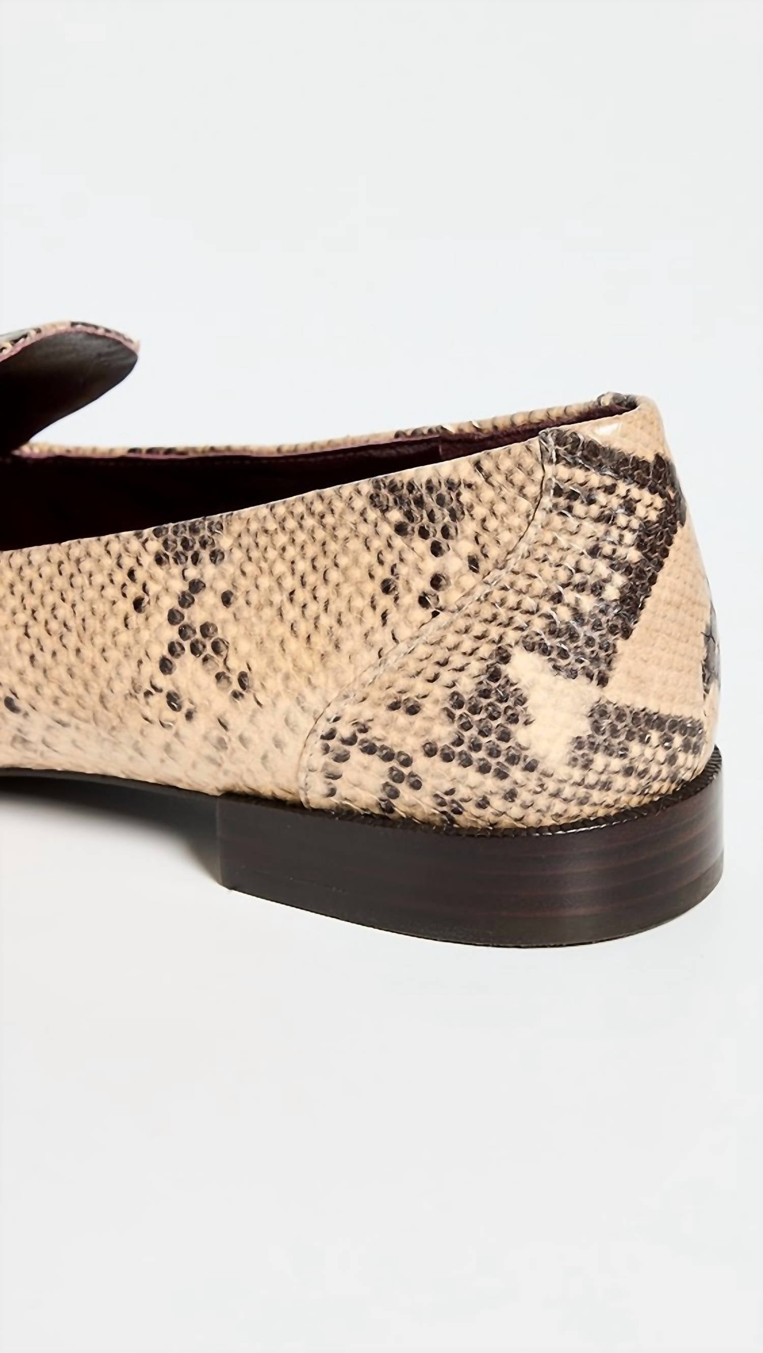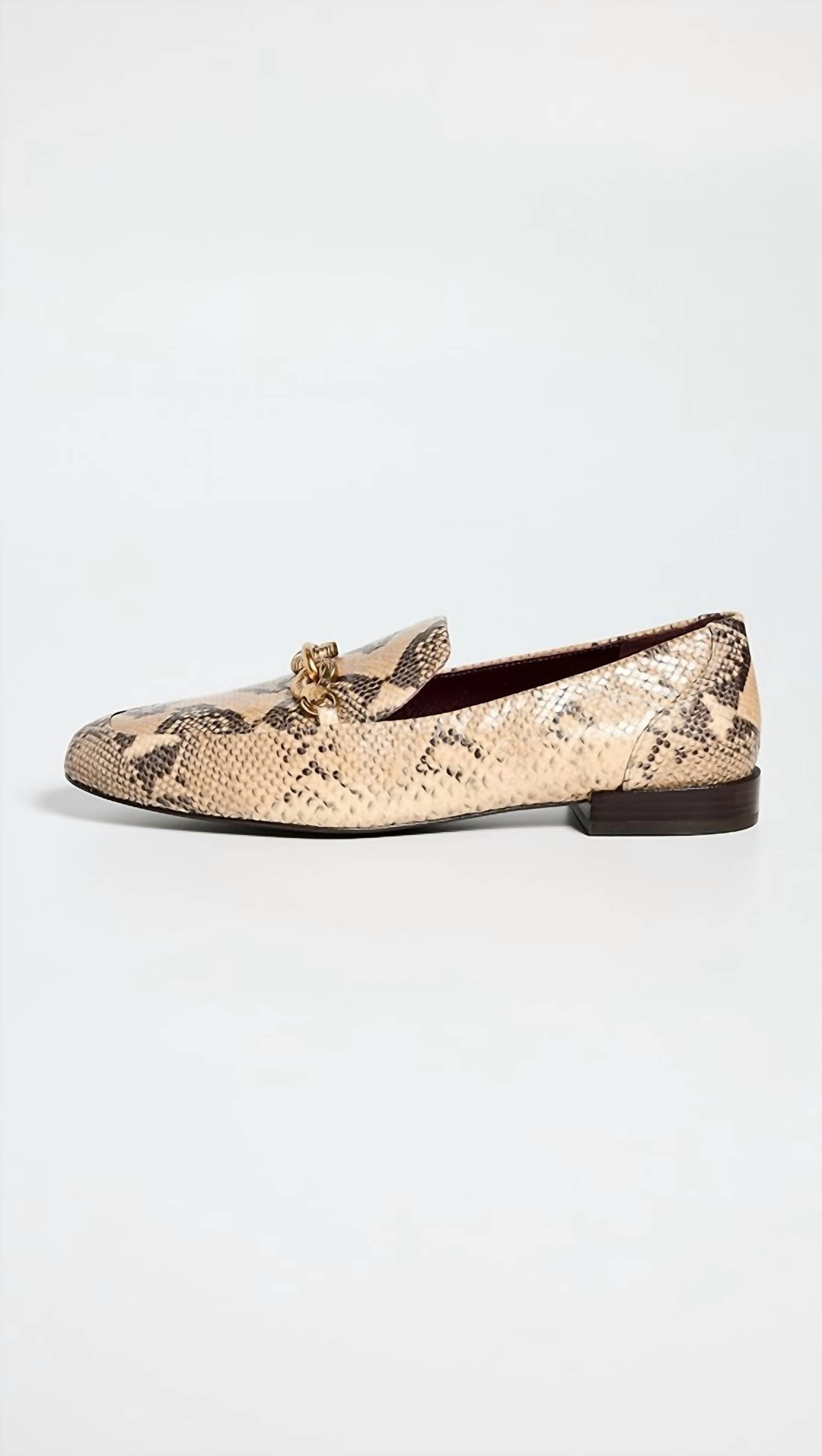 A preppy yet feminine take on the classic loafer. Step into timeless elegance with the Women's Jessa Loafer by Tory Burch, a perfect blend of luxury and style. Crafted from snake-embossed sheepskin in a striking Desert Dusk Roccia/gold, this loafer features a gold-tone logo emblem and a horsehead-inspired gold-tone chain vamp. Designed with a round toe and a leather sole complemented by a rubber heel cap, it ensures both fashion and comfort. Ideal for holiday parties and embracing 90s fashion this spring, it makes a sophisticated statement for any wardrobe.