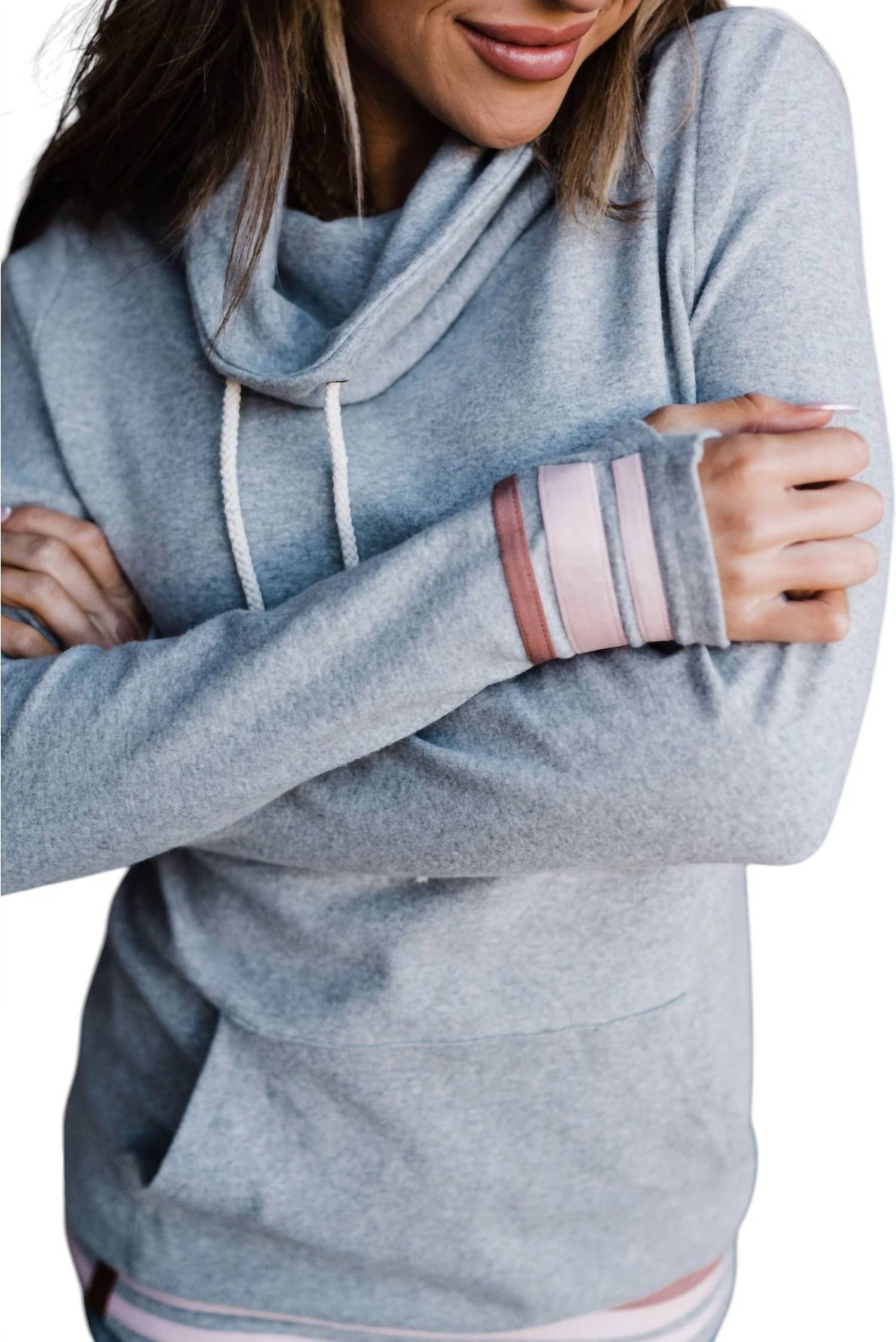 This sweatshirt features a cowl neck, long sleeves, and a pull-on style. It has an allover grey color with pink and mauve stripe accents, made from 95% cotton and 5% spandex with triple stretch for a fitted look.