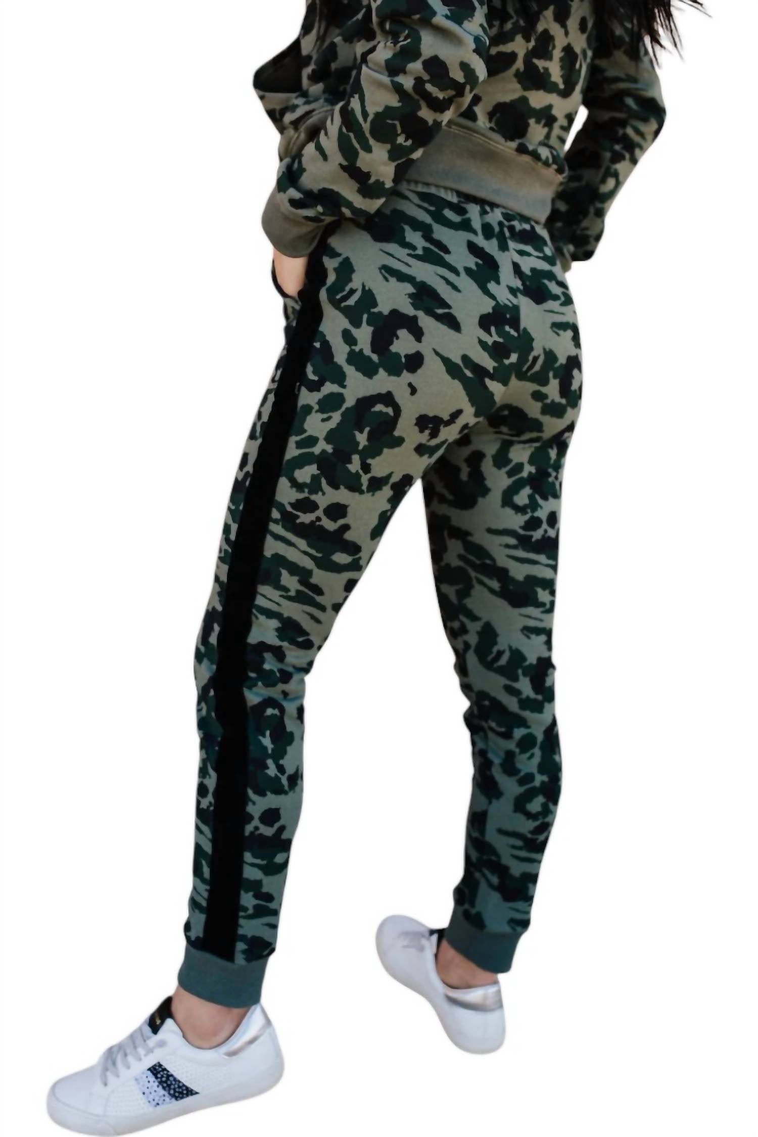 These joggers feature a green leopard print with black stripes, ribbed cuffs and waistband, side pockets, and double stretch for added comfort and flexibility.